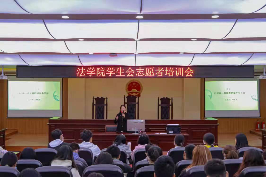 10月12日上午,法学院在东启智楼二楼西模拟法庭举办了学生干部(志愿者)培训会,培训由法学院党政办主任田俊萍主讲,来自21级的46名学生干部(志愿者)参加了培训。