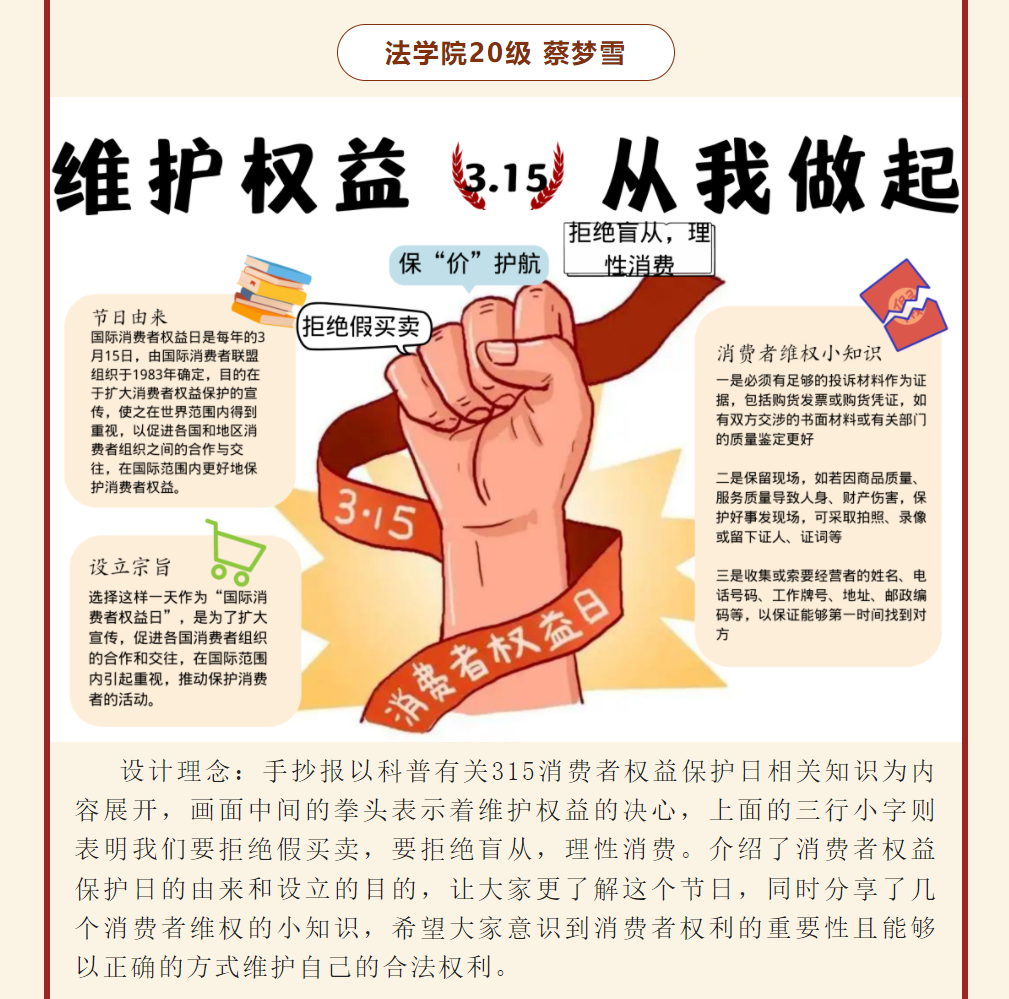 今年是第40个“3·15”国际消费者权益日。许昌学院法学会、法学院学生会生活权益部、法学院青年志愿协会围绕“公平守正 安心消费”主题,开展了一系列“3·15国际消费者权益日”宣传活动。