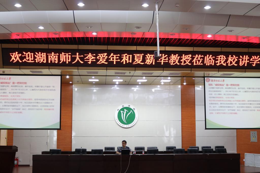 2017年6月14日上午,湖南师范大学法学院副院长李爱年教授和夏新华教授应邀来我院做学术报告。李爱年教授的报告题为《生态文明背景下环境法制建设》,从生态文明建设的视角,论述了我国现行环境法的进步之处和不足之处。夏新华教授的报告题为《埃及宪政危机及启示》,论述了埃及宪政的历史和特点,重点分析了埃及2011年到2014年间的三次政治变局的原因和启示。演讲结束后,李教授和夏教授回答了师生的现场提问。崔秀花院长主持报告会,她高度评价了李、夏二位教授的报告并致感谢。
