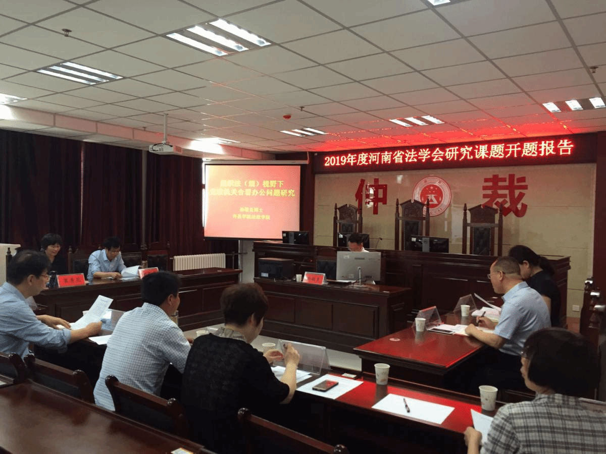 2019年5月24日上午,我院孙敬良博士主持的河南省法学会重点委托课题《行政法(规)视野下党政机关合署办公问题研究》开题会在我院模拟仲裁庭顺利举行。河南省法学会刘晓娜主任、许昌市法学会秘书长周广兵、马克思主义学院院长寇鸿顺参加会议,我院崔秀花院长、唐战立书记、赵丽敏老师、王忠灿博士、冯振强博士、邢琳老师、柴丽老师、李杰老师、徒芳草老师等参加此次开题会。会议由崔秀花院长主持。