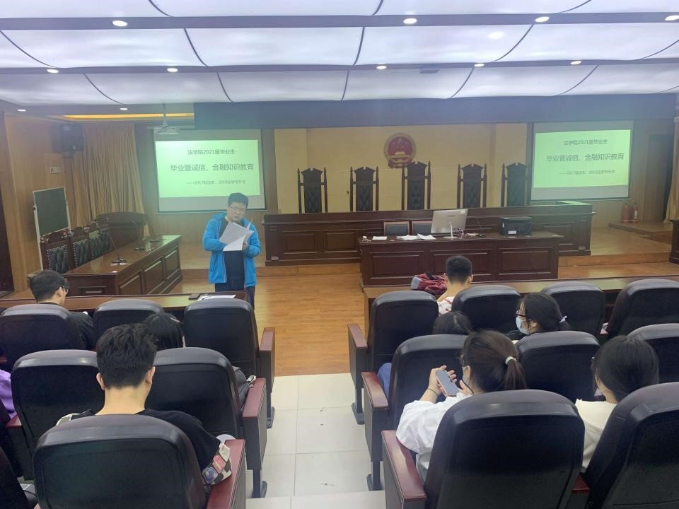 为做好2021届贷款毕业生的离校还款工作,理清贷款毕业生对助学贷款相关问题的疑惑,让同学们充分认识到及时还息按时还贷的重要性,我院于2021年4月29日在模拟法庭开展了2021届贷款毕业生诚信还款教育活动,集中讲解毕业生助学贷款还款还息事宜,解答同学们的问题。此次活动由2017级法本、2019级法学专升本辅导员王彬彬主持,2021届全体贷款毕业生参会。