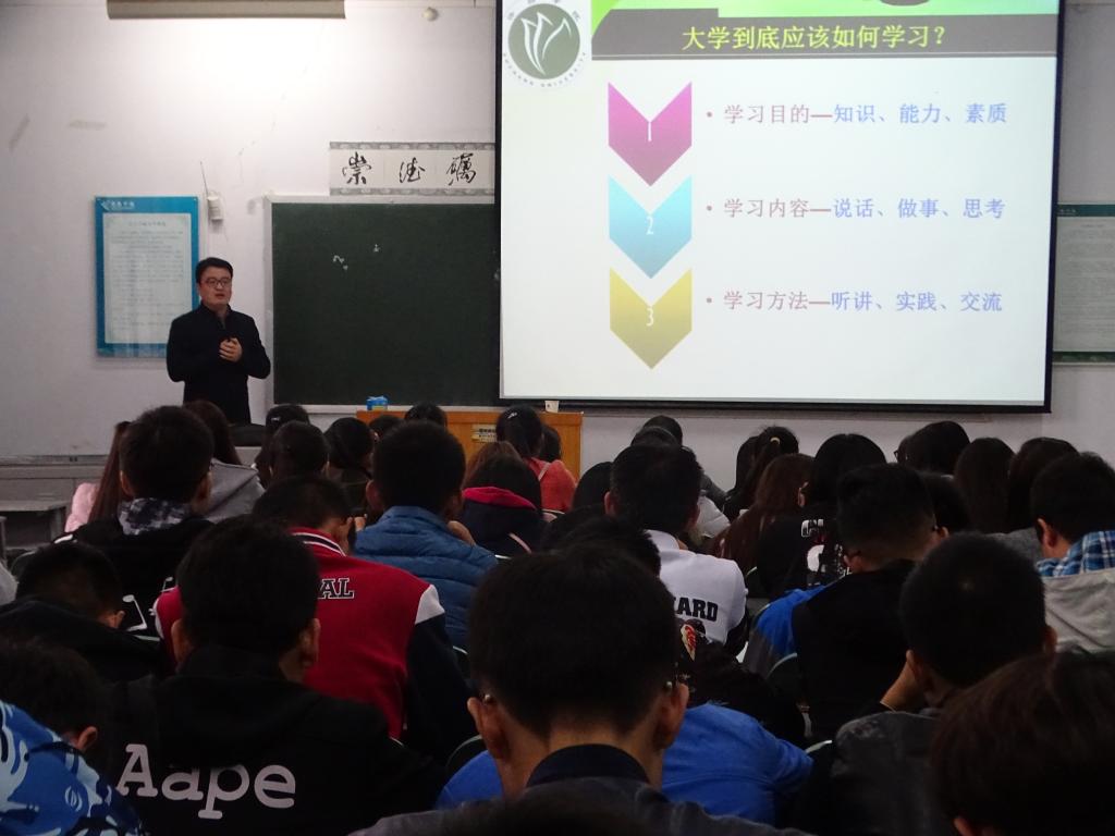 讲座上,张磊老师首先就“什么是大学”作出细致讲解。他指出:“大学是一个传承知识、培养人才、教书育人的地方”。随后,张老师从大处着眼,小处着手,围绕“学习目的、学习内容、学习方法”三个方面展开全面详细的阐述。他说明理论知识并不是学习的唯一目的,更要求大家在职业能力、综合素质等方面在大学四年的砥砺中要有一定的提高。除此以外,他着重强调要以“说话、做事、思考”为主要学习内容,以“听讲、实践、交流”为学习方法进行学习。讲座中,张老师结合个人经历深入剖析如何有效待人接物。张老师以诙谐幽默的语言、深入浅出的阐述赢得全体在场学生的肯定。讲座最后,张老师表示同学在今后学习生活中可以就所遇问题,随时与老师积极交流、共同解决,老师也一定会热心给予帮助。整个讲座气氛轻松活跃,在热烈的掌声中圆满结束。