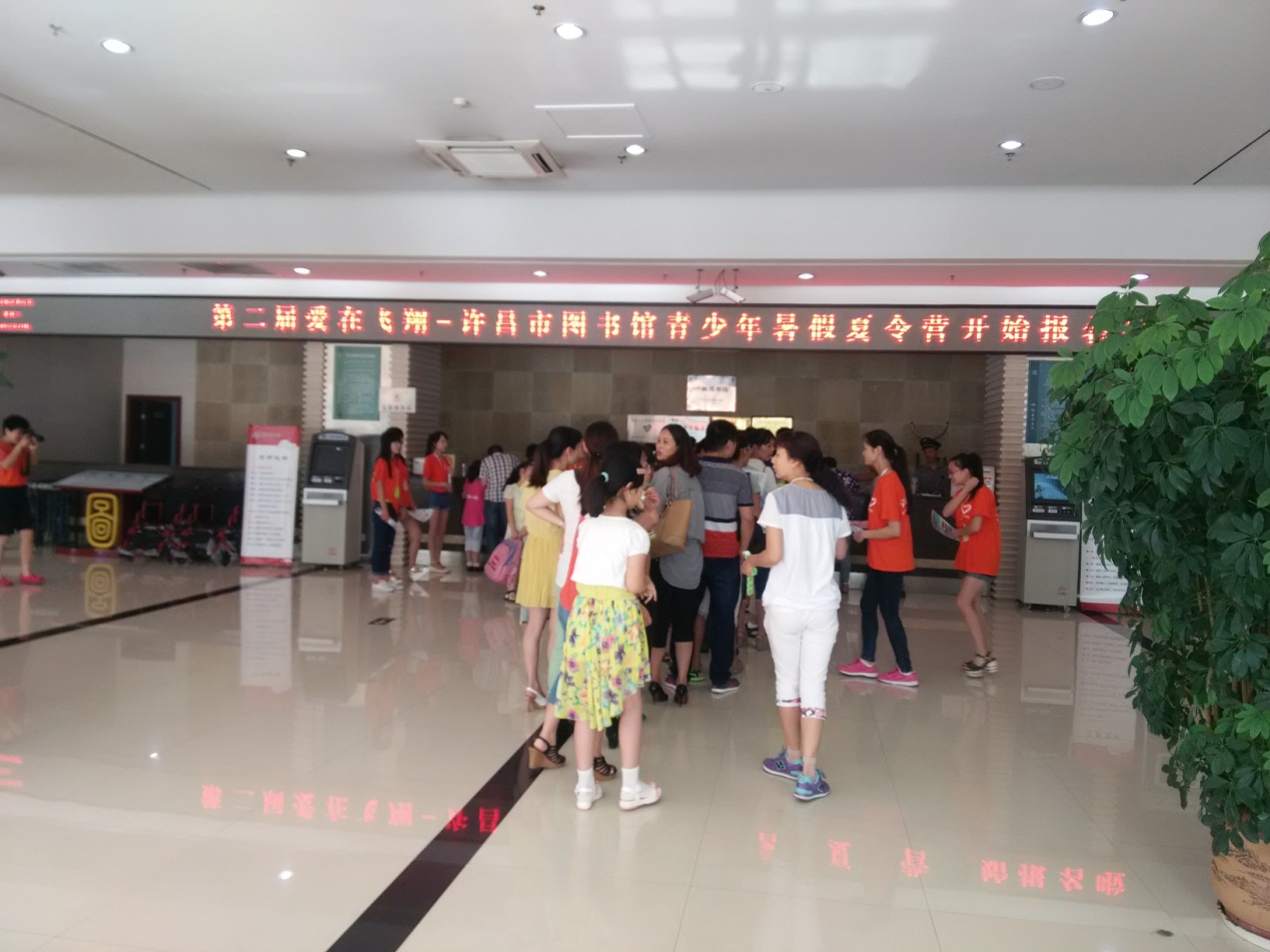 2015年7月1日上午7时,许昌学院“爱在飞翔—2015年暑期青少年图书馆活动”实践队在指导老师石玉英的带领下前往许昌市图书馆开展实践活动的报名工作。