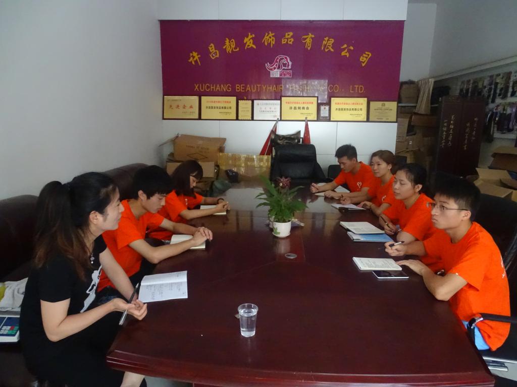 在公司员工的热情接待下,队员们与公司代表在会议室进行了轻松愉快的交流。首先,代表为大家讲述了该公司进行电商外贸的创业经历,寥寥数句却让同学们体会到了机遇的宝贵与把握时机的重要性。推而广之,代表指出,队员们正值年少,应该多多学习与发制品相关的专业知识、积累专业经验,为将来抓住机遇做好准备。随后,队员们询问了该公司电商外贸的交易流程,代表表示,许昌作为内陆假发生产基地,其主要消费对象为国外中端消费者,在网络发达的现今,外国消费者可通过多种传媒形式方便快捷的订购该公司产品。再经由便捷物流及时送达世界各地。谈及公司面临的问题,代表表示,网路信息时代的到来为公司带来发展机遇的同时,也带来了诸多挑战,各类水平参差不齐的发制品电商纷纷出现,行业竞争压机增大,市场趋于饱和,公司不得不顺应发展而转型。紧接着,公司代表询问了瑞贝卡学院的发展方向与近期招生状况,并对暑期社会实践的队员们表达了亲切的慰问,且表示有意招聘我院有能力与时间的学生进入该公司实习。交流在轻松融洽的氛围中结束。