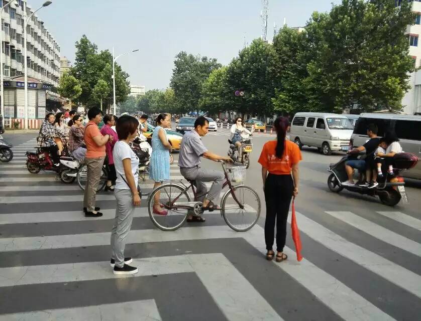 对于行人闯红灯、非机动车辆违规行驶等行为,交通局一直采用合理配置交通协管员的方法,及时提醒市民遵守交通秩序,预防安全事故的发生。为更加有效地协助交警维持秩序,“法治通城,绿色出行”社会实践队员们接受临时培训成为了道路引导员,积极倡导市民文明出行。实践队员们在维持秩序中发现,行人横穿马路大多是因为安全意识薄弱,并且老年人占据多数。
