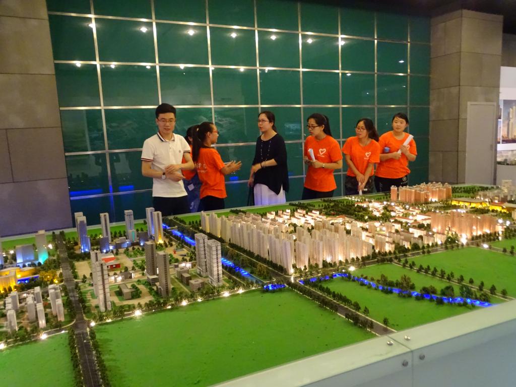 “下午好,欢迎来到许昌市规划展览馆。首先对展馆做一个简单的介绍。现在映入眼帘的是浮雕墙,我们常说:“眼睛是人类心灵的窗户,这是一只眼睛的造型,许昌市规划展览馆是许昌这座城市的‘眼睛’。”这便是实践队员们在为前来参观的市民讲解规划展览馆的发展历史的情景。实践队员们带领市民参观沙盘的时候,指导老师董鑫亲切地与大家交流,讲述许昌近年来的巨大变化。从中,大家也了解到眼前的沙盘是由许昌学院勤工俭学的学生设计完成的,大家纷纷对这位设计者给予赞美,并要向其学习。讲解完毕后,市民们对实践队员给予了高度的赞赏和鼓励。与此同时,指导老师对队员们的优秀表现表示出了极大的肯定。