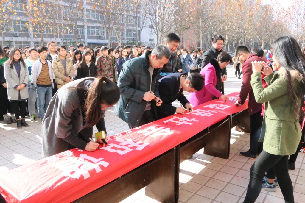 法政学院院长崔秀花教授在会上发表重要讲话。崔院长指出:“弘扬宪法精神,开展法制宣传教育,是全面贯彻落实科学发展观的重要举措,是提高全民法律素质、推进依法治国基本方略的一项基础性工作,也是推动我校依法治校工作的重要举措,其需要当代大学生更好的投身参与其中。”法政学院学生代表冯国君同学在学生代表发言环节,倡导同学们通过法制宣传活动,积极弘扬宪法精神,为推动建设创新、协调、绿色、开放、共享的法治社会贡献自己的一份力量。随后,由法学会代表张滕岳同学领誓,在庄严肃穆的氛围中,全体师生举起右手共同郑重宣誓。活动最后,与会领导、老师和同学们在“增强宪法意识,推动科学发展,促进社会和谐”的条幅上签名。