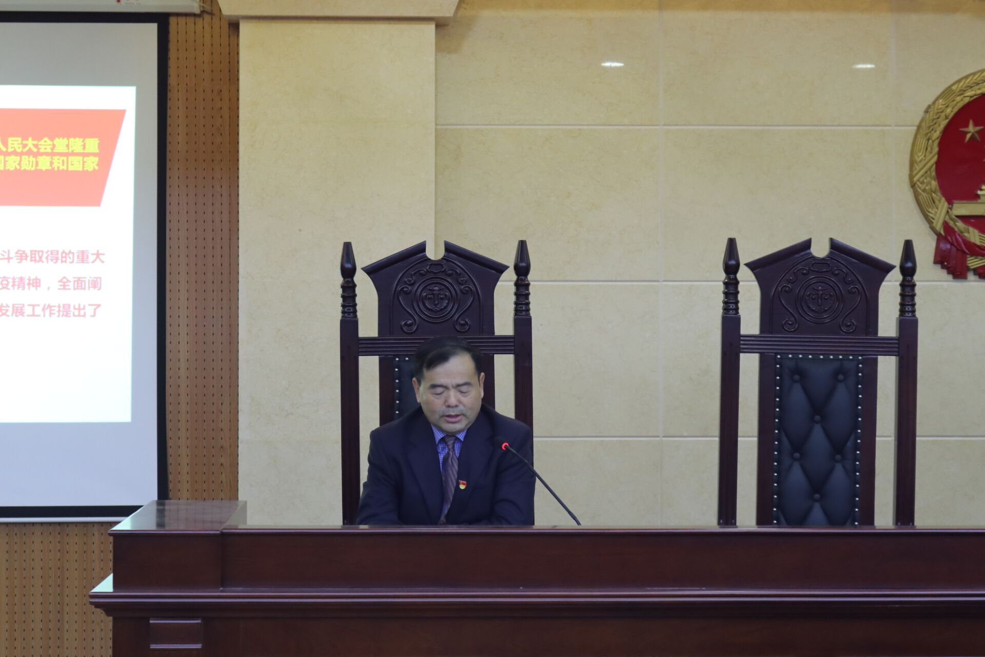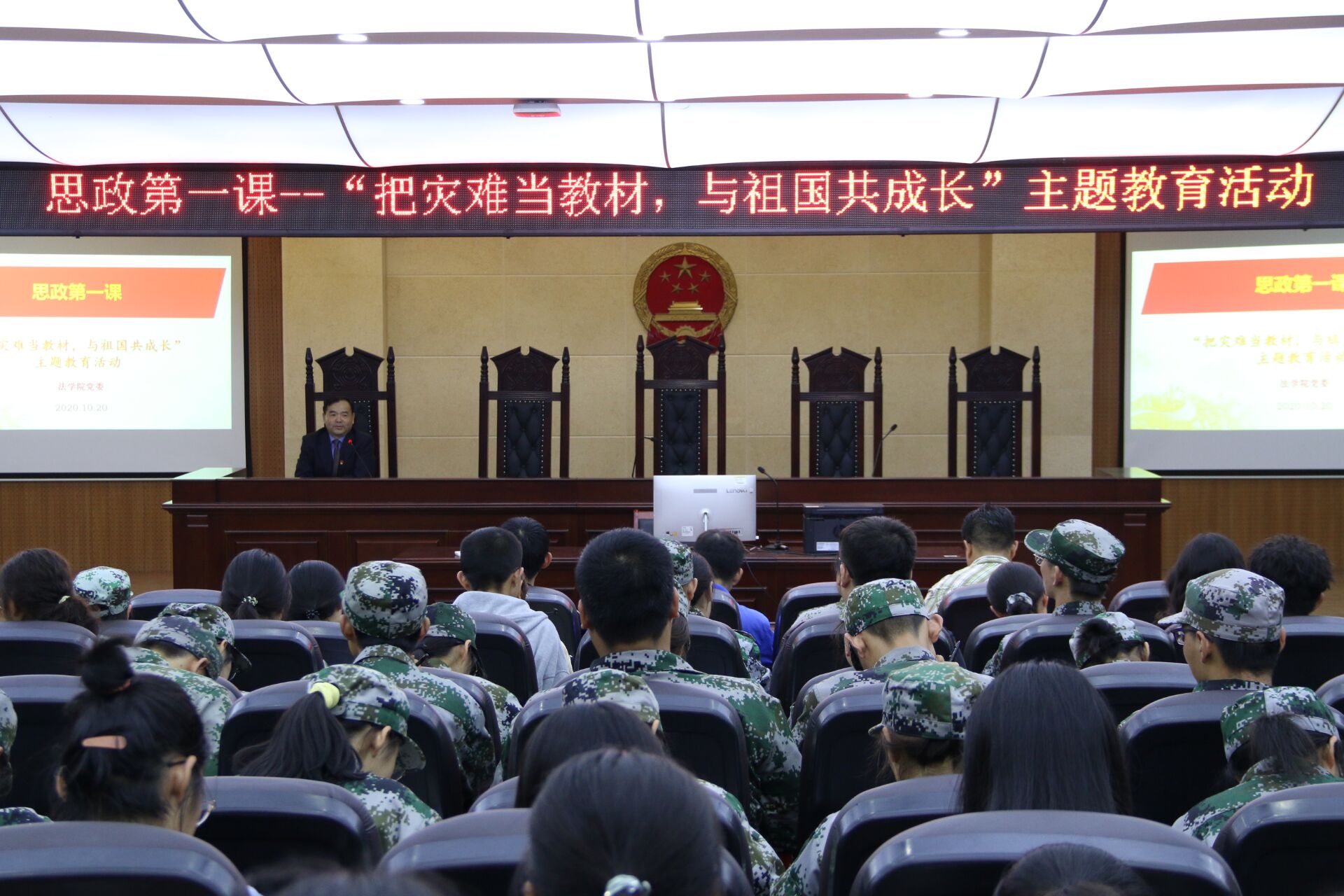 2020年10月20日晚7点,我院党委书记孟凡根以“把灾难当教材,与祖国共成长”为主题在模拟法庭为新生上了一堂别开生面的思政第一课。此次教育活动由20级辅导员李静雅老师主持,20级全体新生到场聆听。
