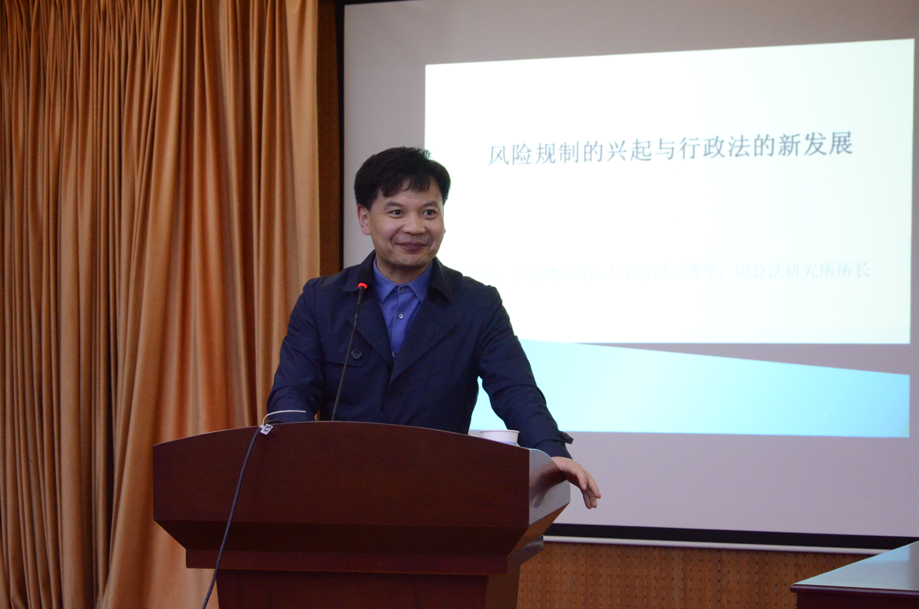 为加强同学们对我国应急管理体系和能力建设方面的了解,11月20日下午,我院在模拟法庭成功举办了“风险规制的兴起与行政法的新发展”主题讲座。讲座邀请了中南财经政法大学教授、博士生导师、应急法研究所所长戚建刚教授主讲,法学院院长周耀宏老师主持本次讲座。法学院部分老师及18级全体同学到场聆听。