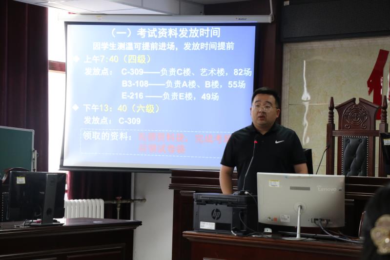 院长周耀宏做总结,再次强调了全国大学英语四、六级考试的重要性,要求各位监考教师本着对学院负责的态度,在思想上高度重视,明确任务和目标,增强责任感和使命感,确保考试过程中不出丝毫差错。