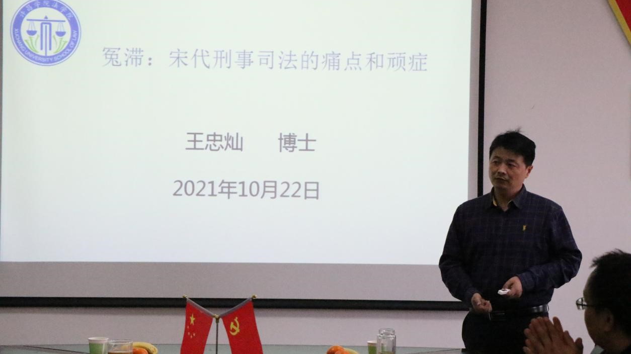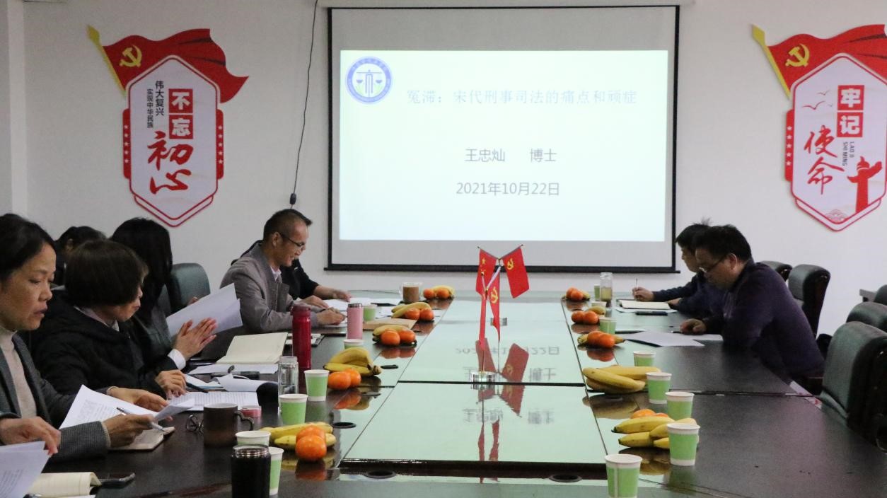 10月22日,法学院教工第三党支部、法理法史教研室在1225举行“三常”党建沙龙之“颍川法苑”学术沙龙活动,沙龙邀请我院王忠灿博士做了题为“冤滞:宋代刑事司法中的痛点和顽症”学术报告。活动由教工第三党支部书记、法理法史教研室主任尹晓兵主持,马克思主义学院巴文泽副教授、文史与传媒学院罗操博士、教研室全体教师以及我院部分师生参与了本次学术沙龙活动。