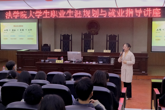 为进一步提升大学生职业生涯规划能力,引导大学生树立正确的人生观、价值观、就业观,10月26日晚上7时,我院在模拟法庭开展大学生职业生涯规划与就业指导讲座。本次讲座由我院党政办公室主任田俊萍老师主讲,我院党委副书记刘毅飞老师出席并主持讲座,就业专干杨晓丽老师以及19级、20级、21级同学到场聆听。