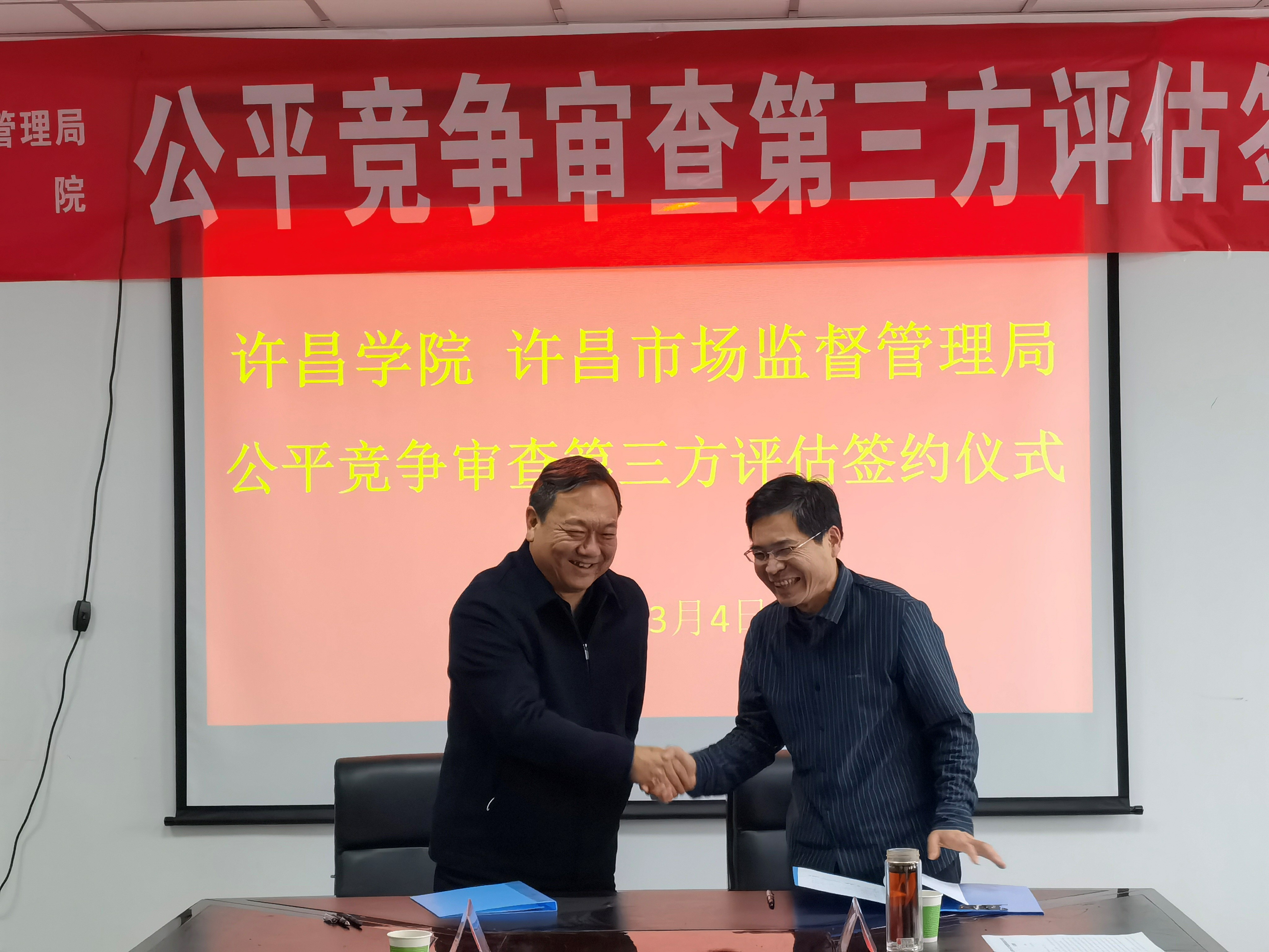 3月4日上午,我院与许昌市场监管局公平竞争审查第三方评估签约仪式在文综楼1225会议室举行。我院孟凡根书记、周耀宏院长、刘毅飞副书记、赵丽敏副院长、王忠灿副院长、许昌市场监督管理局高洪涛副局长、许昌市公平竞争审查联席会议办公室全体工作人员及我院全体科级干部出席了签约仪式。会议由王忠灿副院长主持。