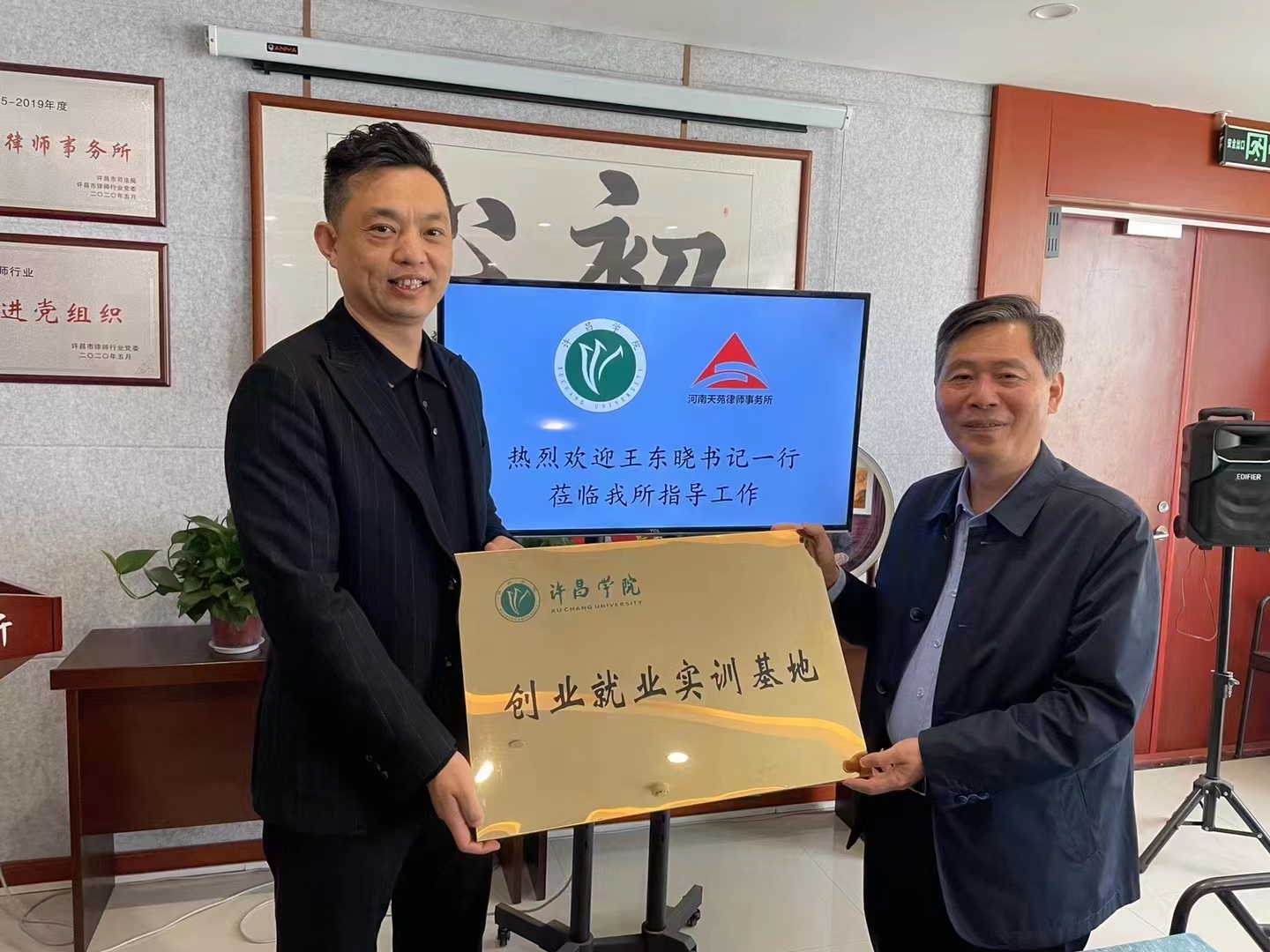王东晓书记还代表法学院分别为两个律所授予了“许昌学院创业就业实训基地”和“许昌学院法学院法学实践教学基地”的牌匾。