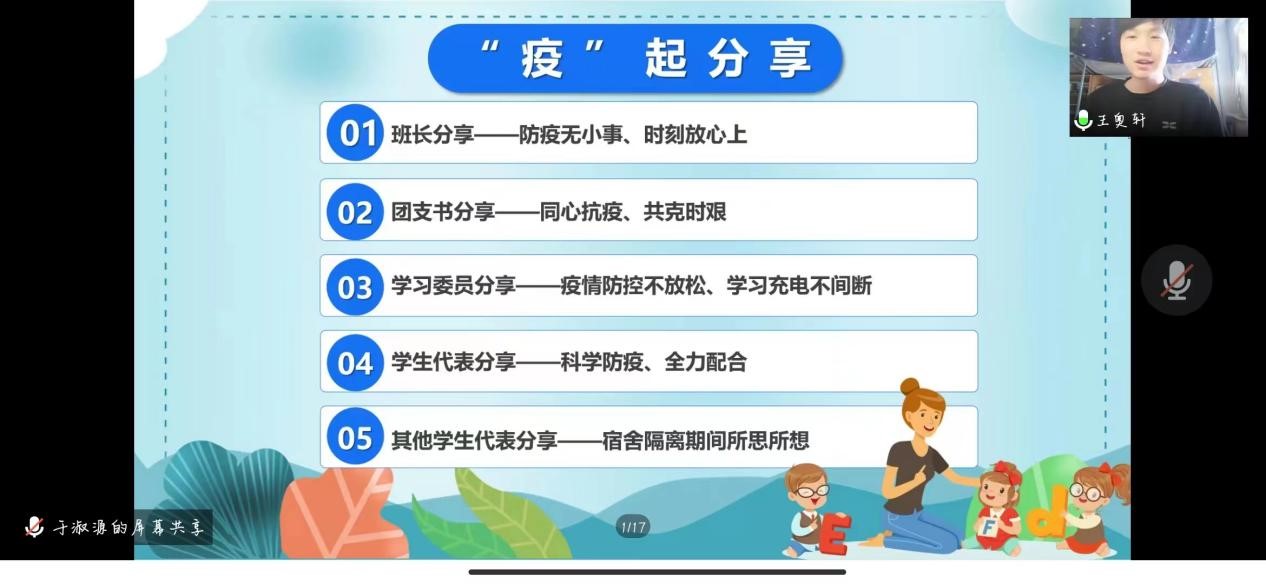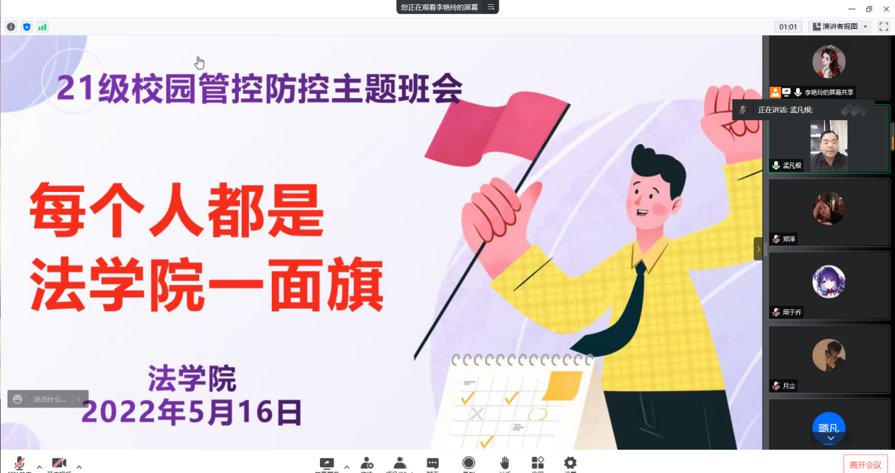 主题班会上,各年级辅导员老师结合学生实际,通过“疫”起分享、“疫”起学习、“疫”起畅想等多个环节开展了一场场有声有色的班会,向全体学生传达学校现阶段疫情防控管理规定、讲述战疫故事,进行心理辅导;引导全体学生遵守纪律,珍惜抗疫成果,全面配合校园做好分等级管理,切实筑牢青年学生抗击疫情的坚定信心。班会上,各年级辅导员还就学生考研、法考、就业等工作进行重点指导,引导学生合理安排学习生活,突破时空限制实现学习新模式。