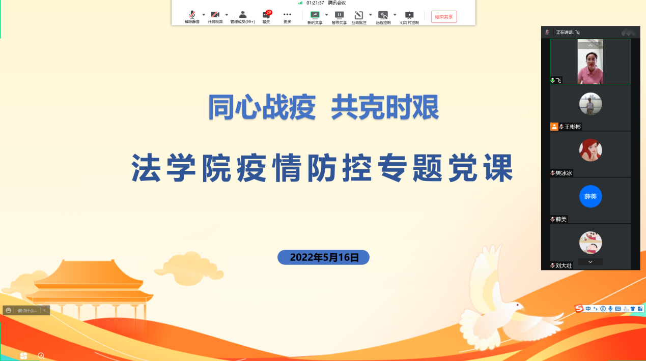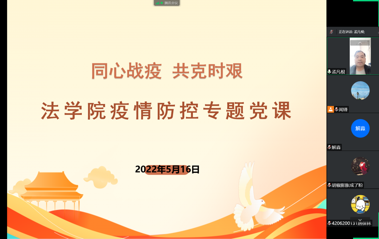 为进一步做好疫情防控工作,强化责任担当、稳定思想情绪,树立必胜信心、积极主动作为,全面配合校园分等级管理,切实保障师生生命安全及身心健康。2022年5月16日,法学院组织开展了“同心战疫共克时艰”校园管控期主题班会、专题党课。主题班会由各年级辅导员组织开展,专题党课由法学院党委书记孟凡根、院长周耀宏、党委副书记刘毅飞讲授。法学院全体学生参加。