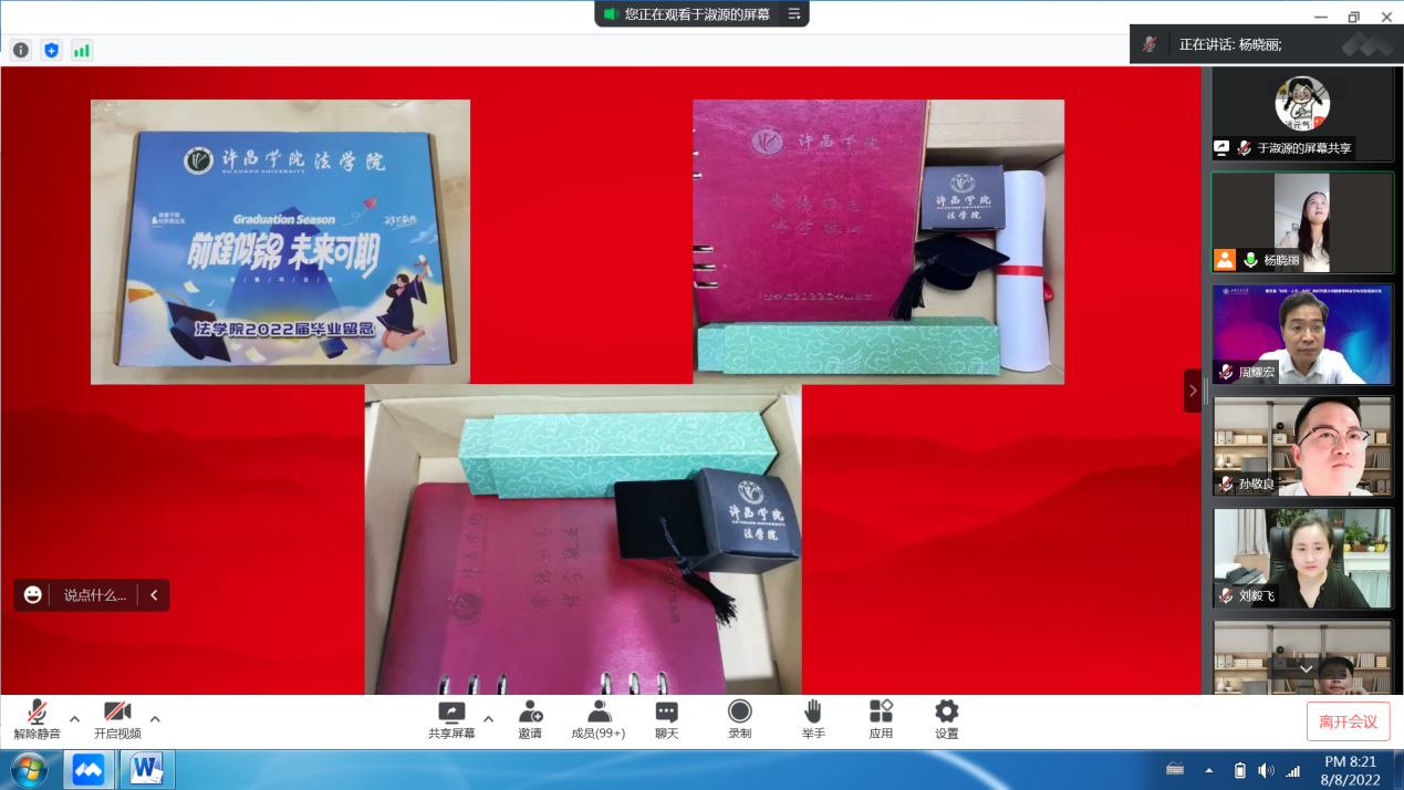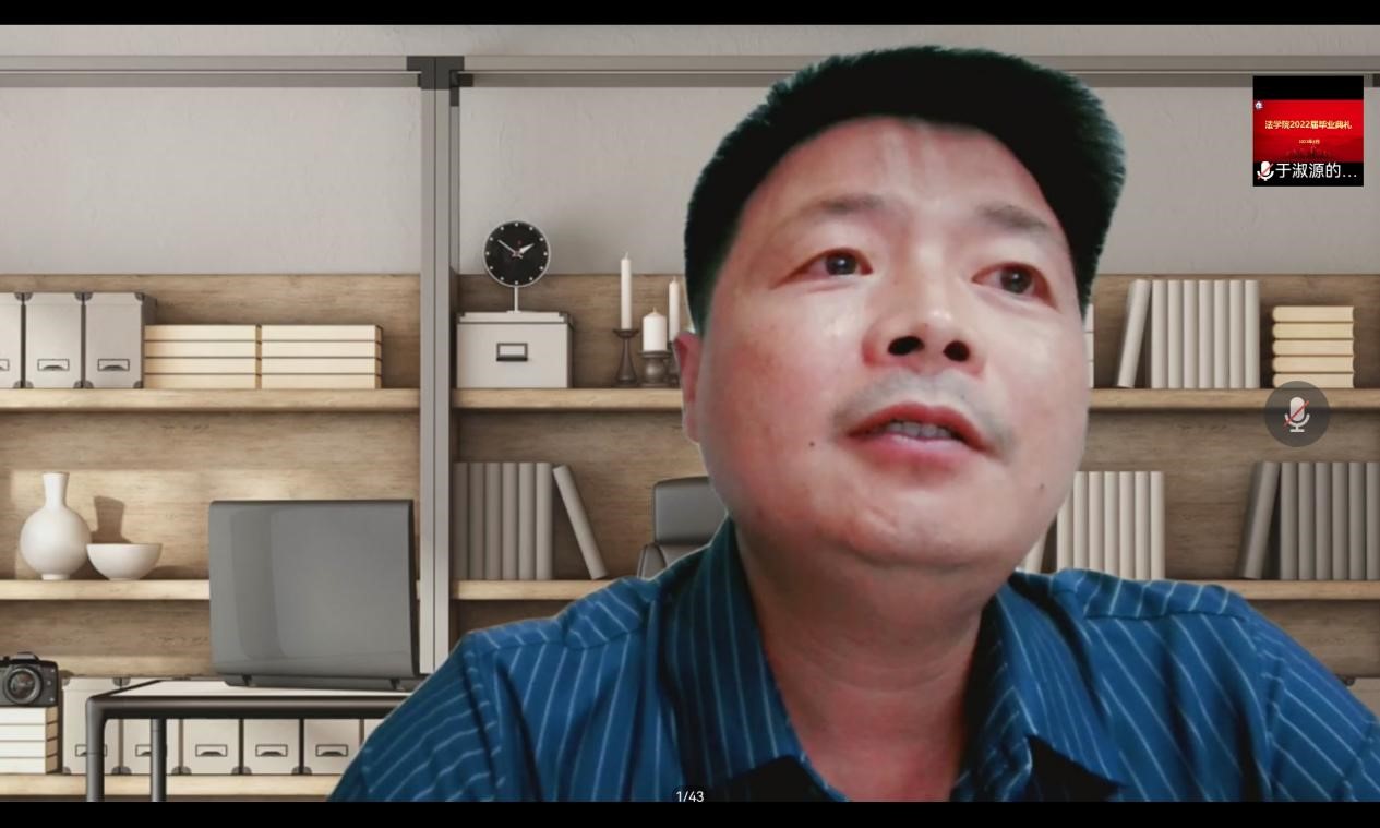 经年师生情,满堂祝福语,只赠学子行。2022年8月8日晚上,法学院在线上举办了2022届毕业典礼。法学院党委书记孟凡根、院长周耀宏、党委副书记刘毅飞、副院长赵丽敏、副院长王忠灿出席毕业典礼,教师代表、毕业班辅导员老师以及全体2022届毕业生参加典礼。典礼由刘毅飞主持。