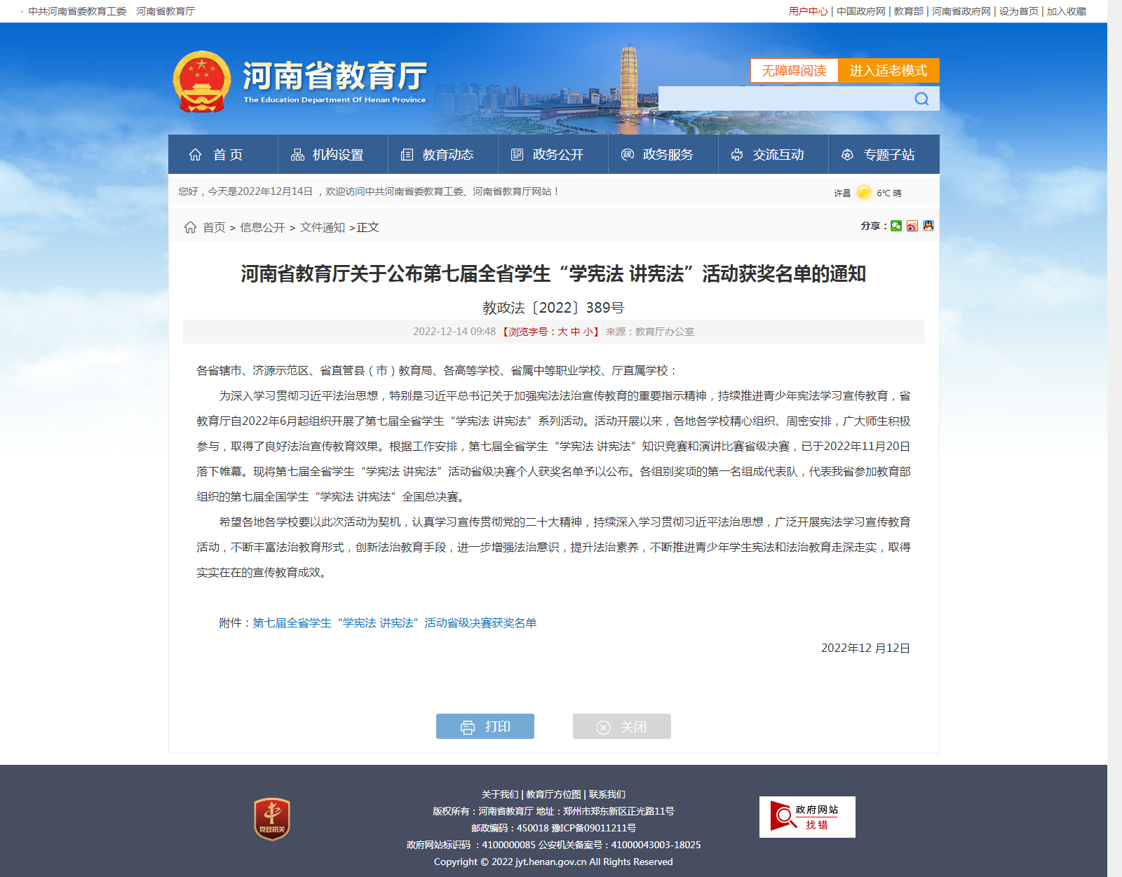 为深入学习贯彻党的二十大精神,贯彻落实习近平法治思想,进一步普及宪法知识、弘扬宪法精神、树立宪法权威,2022年10月,河南省正式启动第七届全国学生“学宪法 讲宪法”活动。本次活动由省教育厅主办,华北水利水电大学、河南教育报刊社承办。比赛分为法治知识竞赛和“学宪法讲宪法”主题演讲两个项目。来自各地各高校的134名知识竞赛选手、107名演讲比赛选手参加了河南赛区决赛。