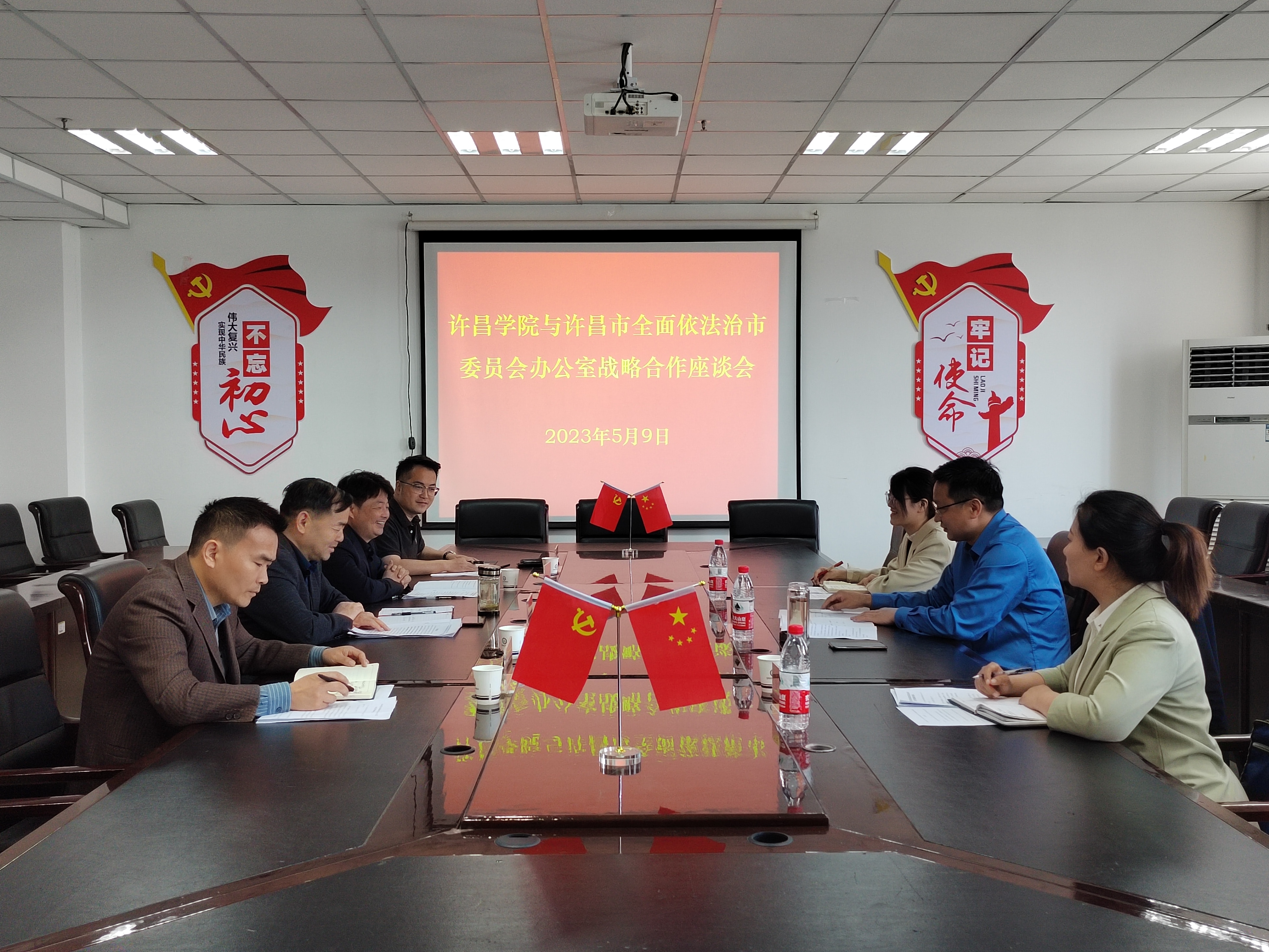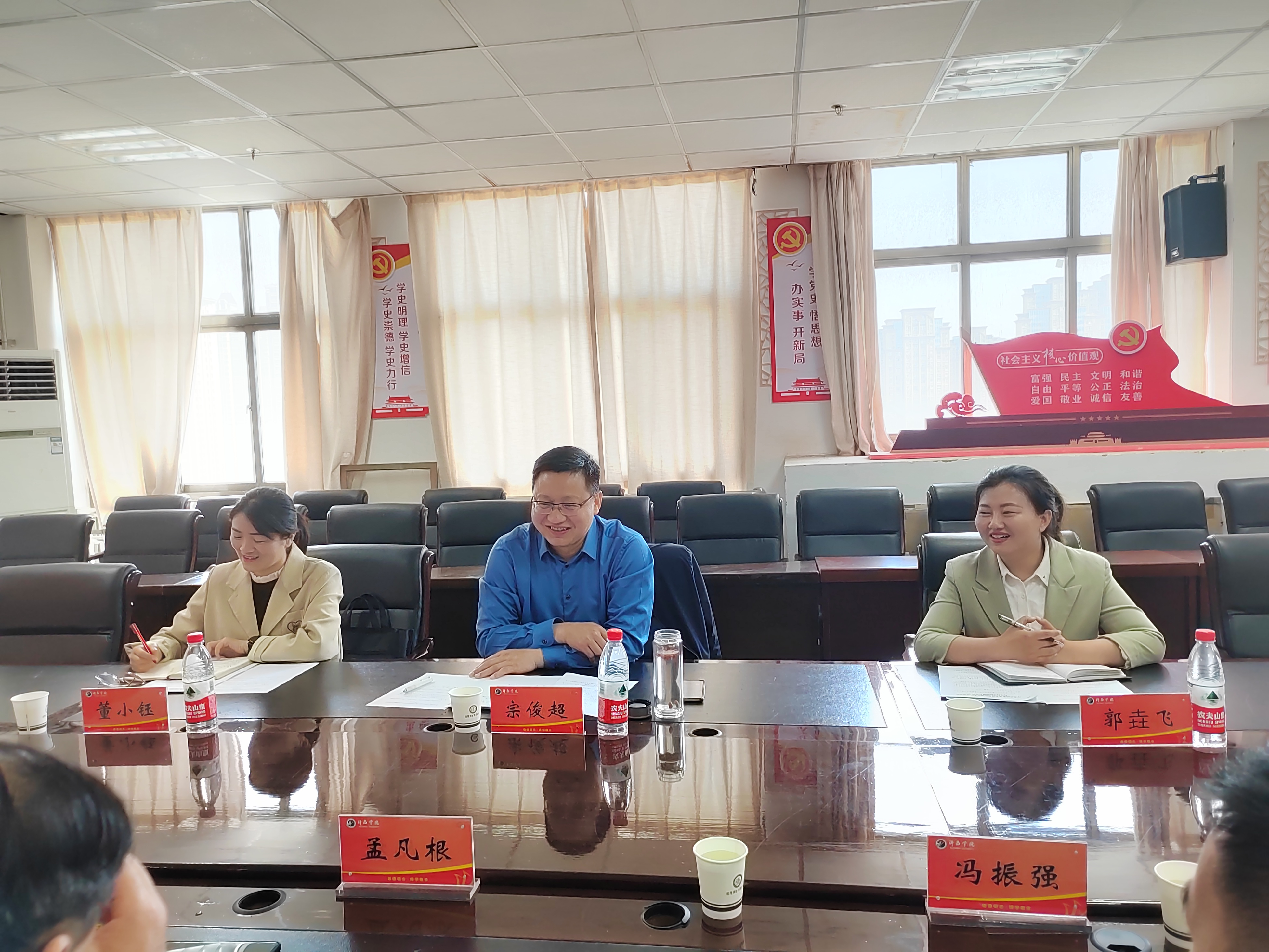 座谈中,宗俊超介绍了中共许昌市委全面依法治市委员会的组成和职责范围,提出双方战略合作的方案。冯振强、孙敬良分别就人才培养、科学研究、实习实训谈了合作计划和设想。随后,双方围绕习近平法治思想学习、全面依法治市理论培训、全面依法治市课题研究、学生岗位见习实习、师生参与法治实践活动等方面展开深入交流。