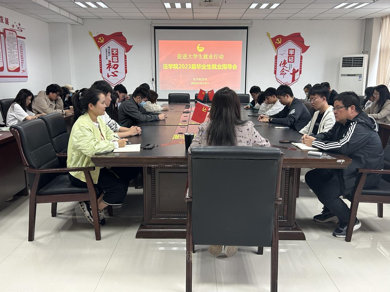 为进一步做好我院2023届毕业生就业工作,深入了解我院毕业生的就业状况,落实毕业生就业指导服务,5月6日下午,法学院于E1225会议室召开2023届毕业生就业指导会。本次会议由法学院党委副书记刘毅飞、团委副书记杨晓丽、毕业班辅导员王彬彬以及2023届学生党员和学生代表参加。