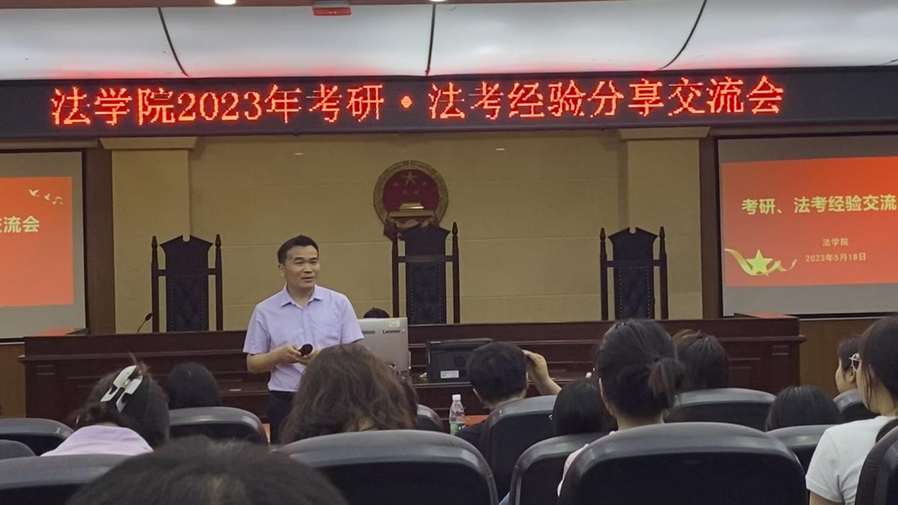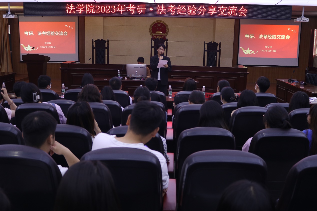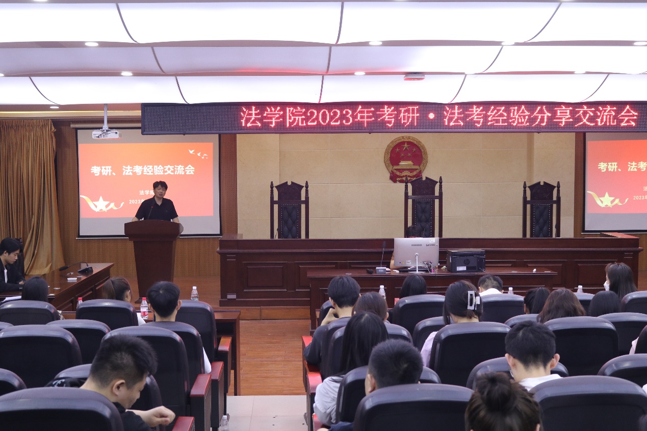 为加强学风建设,帮助同学们明确考研和法考目标,增强备考积极性和自信心,我院于2023年5月18日在模拟法庭举办了考研·法考经验分享交流会。法学院副院长王忠灿、党委副书记刘毅飞、副院长冯振强和各年级辅导员出席会议,此次交流会还邀请到2023届考研、法考成功上岸的优秀学长学姐们做经验分享,20级、21级有意向参加考研、法考的同学到场聆听。