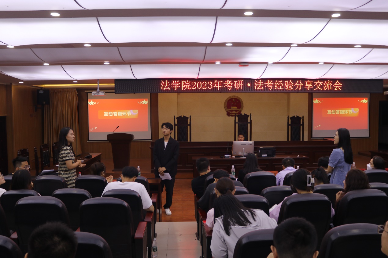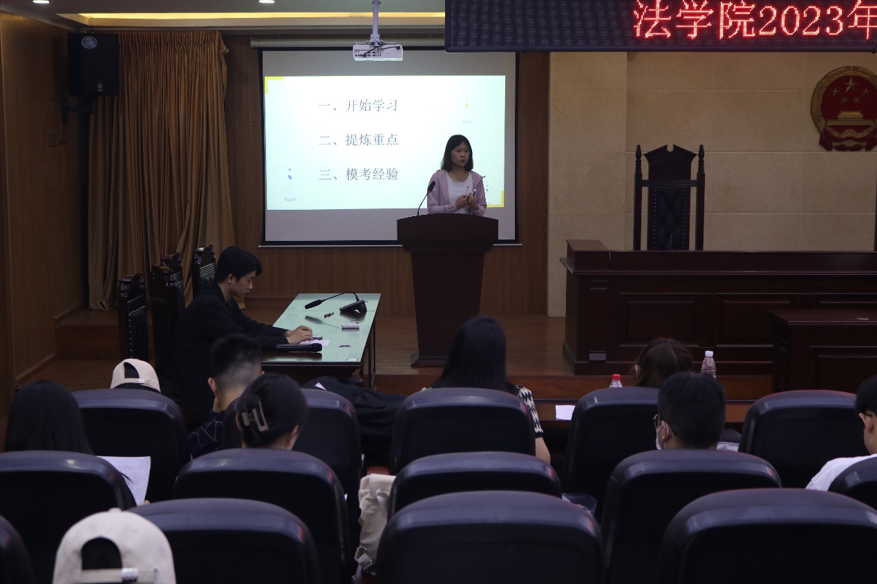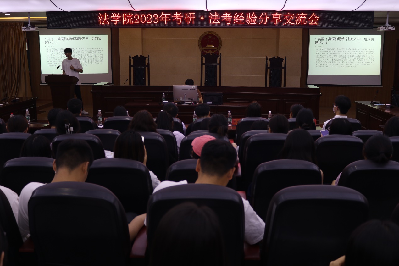 为加强学风建设,帮助同学们明确考研和法考目标,增强备考积极性和自信心,我院于2023年5月18日在模拟法庭举办了考研·法考经验分享交流会。法学院副院长王忠灿、党委副书记刘毅飞、副院长冯振强和各年级辅导员出席会议,此次交流会还邀请到2023届考研、法考成功上岸的优秀学长学姐们做经验分享,20级、21级有意向参加考研、法考的同学到场聆听。