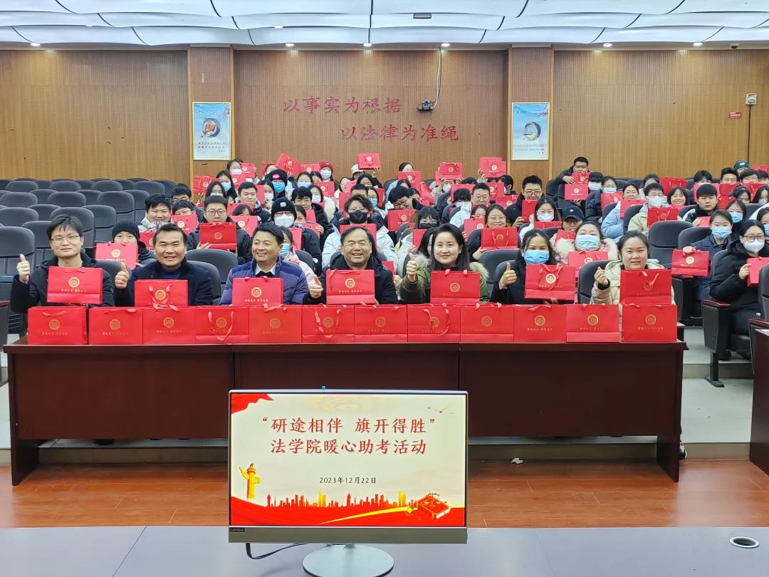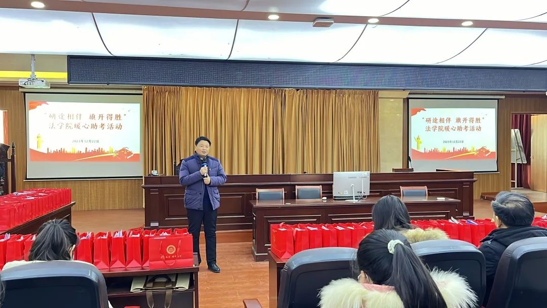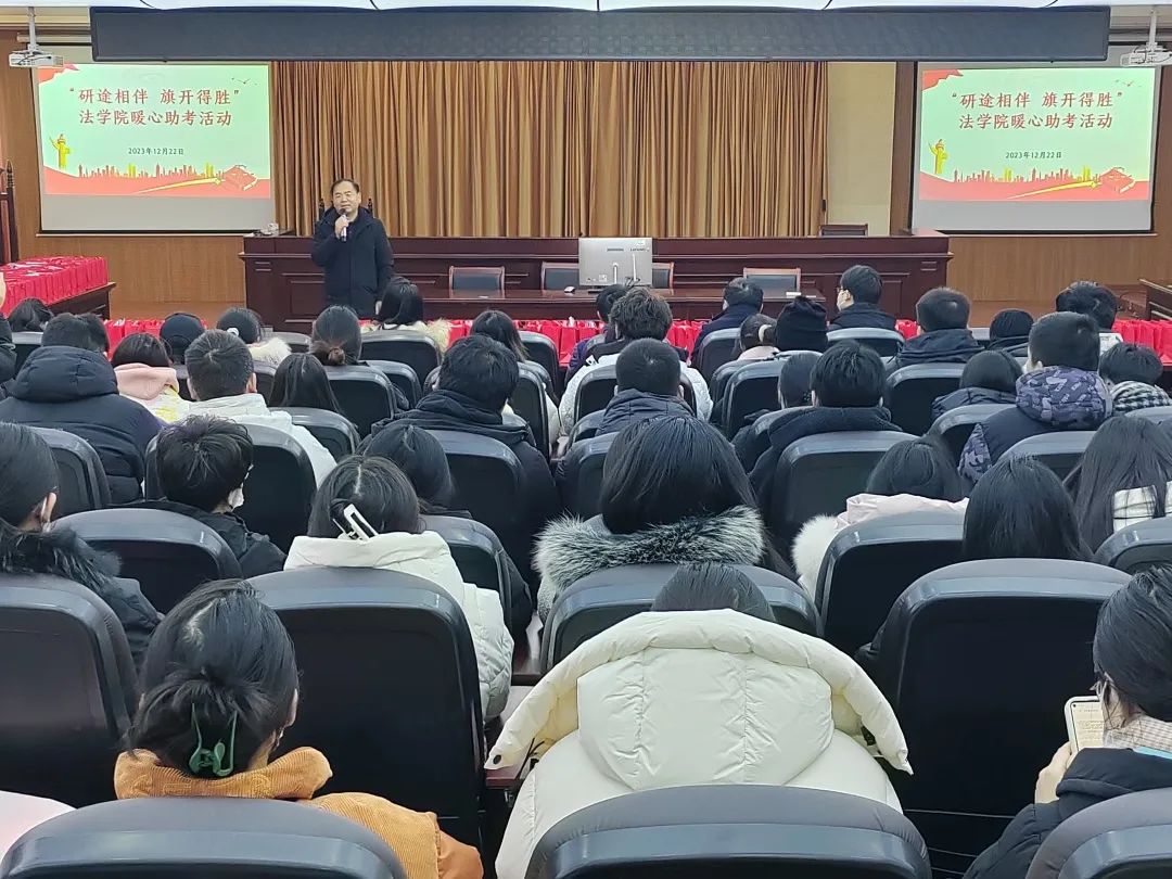 在2024年全国硕士研究生招生考试(初试)来临之际,为帮助考研学子坚定必胜信心、缓解备考压力,2023年12月22日下午,法学院在模拟法庭会议室开展“研途相伴,旗开得胜”暖心助考活动。法学院全体领导班子成员出席,2020级辅导员及参加本届考研的130余名学生参加此次活动。活动由院党委副书记刘毅飞主持。