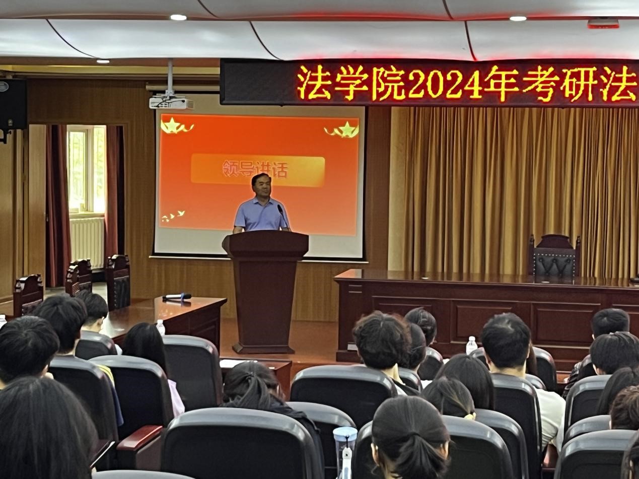 会上,王忠灿作动员讲话。他向通过考研、法考的同学表示热烈祝贺,并希望他们在今后的学习工作中立足新起点、确立新目标、再创新成绩。在分析当前考研和法考形势的基础上,激励在校学生积极规划、脚踏实地,全力备战2025年考研和法考,坚定信念并朝着目标不断奋勇前进。孟凡根作总结讲话,他对2024届毕业生取得的成绩表示肯定和祝贺,鼓励全院同学以优秀学生为榜样,刻苦学习、努力拼搏,夯实基础、筑牢根基,在学习实践中厚植爱国情怀、坚定理想信念,做一个德才兼备、德法兼修的法律人,为国家法治建设添砖加瓦。