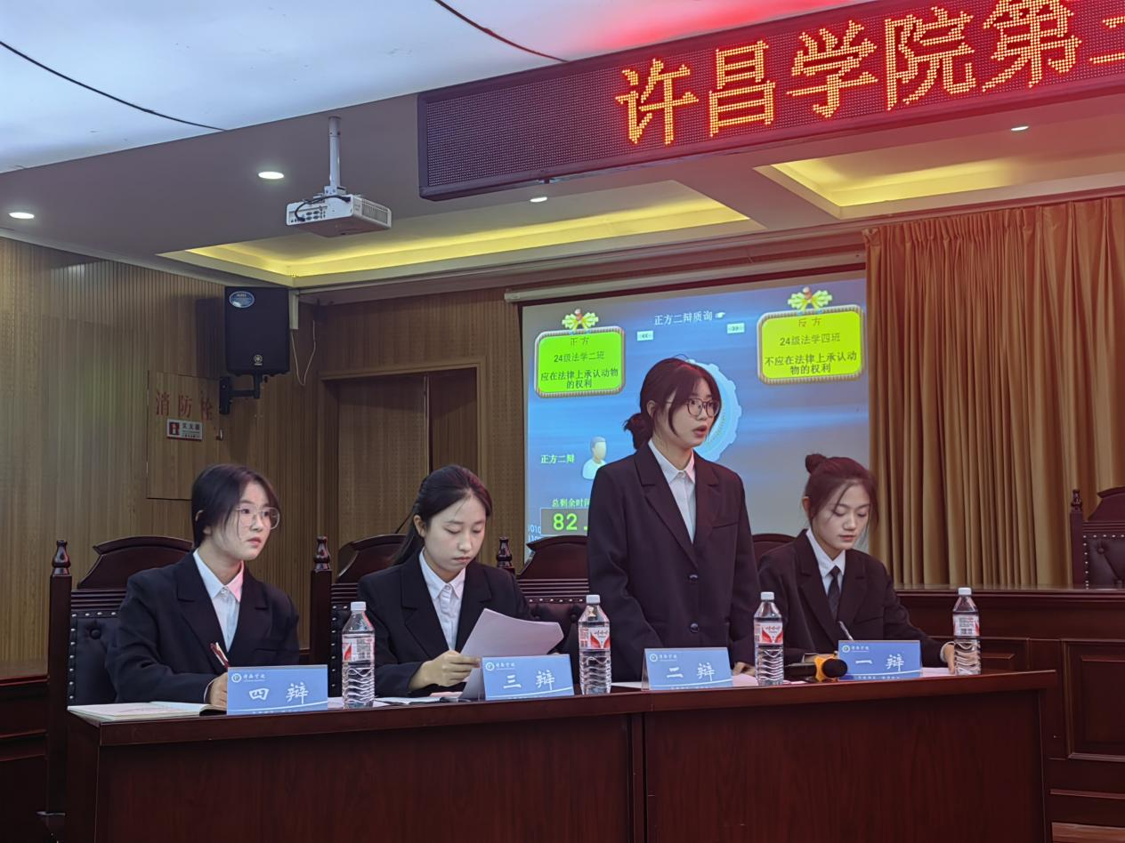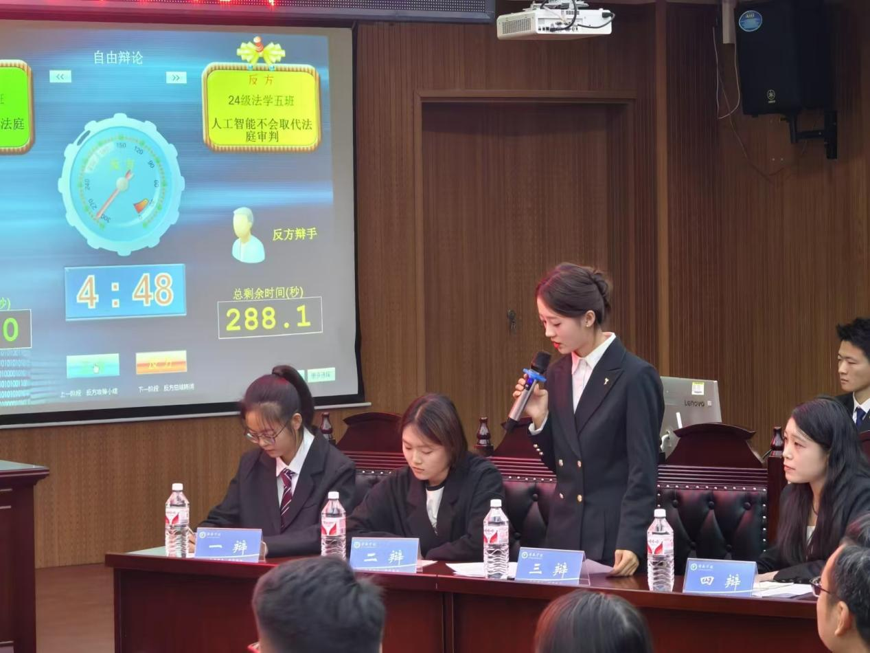 本次比赛历时半个多月,共有来自2024级7支队伍参加。经过初赛的激烈角逐,2024级法学二班、法学四班、法学五班、法学六班的代表队晋级决赛。决赛现场,4支队伍两两对决,围绕“人工智能会不会取代法庭审判”、“应该不应该在法律上承认动物的权利”展开精彩辩论。双方辩手旁征博引、妙语连珠,以敏锐的洞察力、缜密严谨的逻辑思维以及能言善道的辩论技巧,上演了一场场酣畅淋漓的“正反攻防”战,赢得了现场观众的热烈掌声,充分彰显了我院学子良好的精神风貌与专业素养。