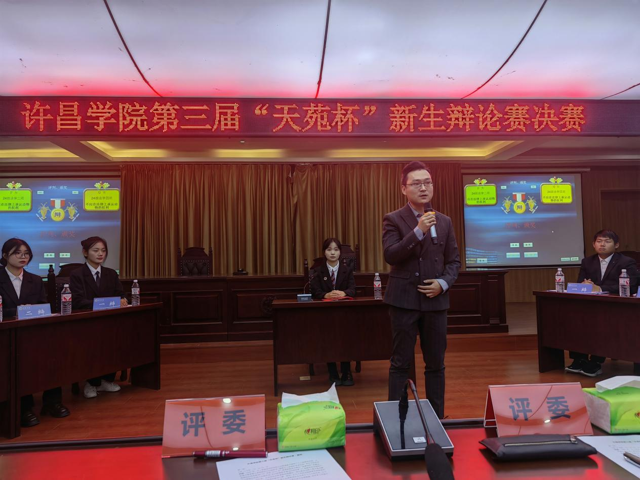 2024年11月3日下午,由我院主办的第三届“天苑杯”新生辩论赛决赛在模拟法庭举行。河南天苑律师事务所副主任杜亚民、副主任郭瑞、法学院副院长孙敬良、院团委书记杨晓丽应邀出席并担任评委,本次辩论赛吸引了我院广大师生到场观赛。