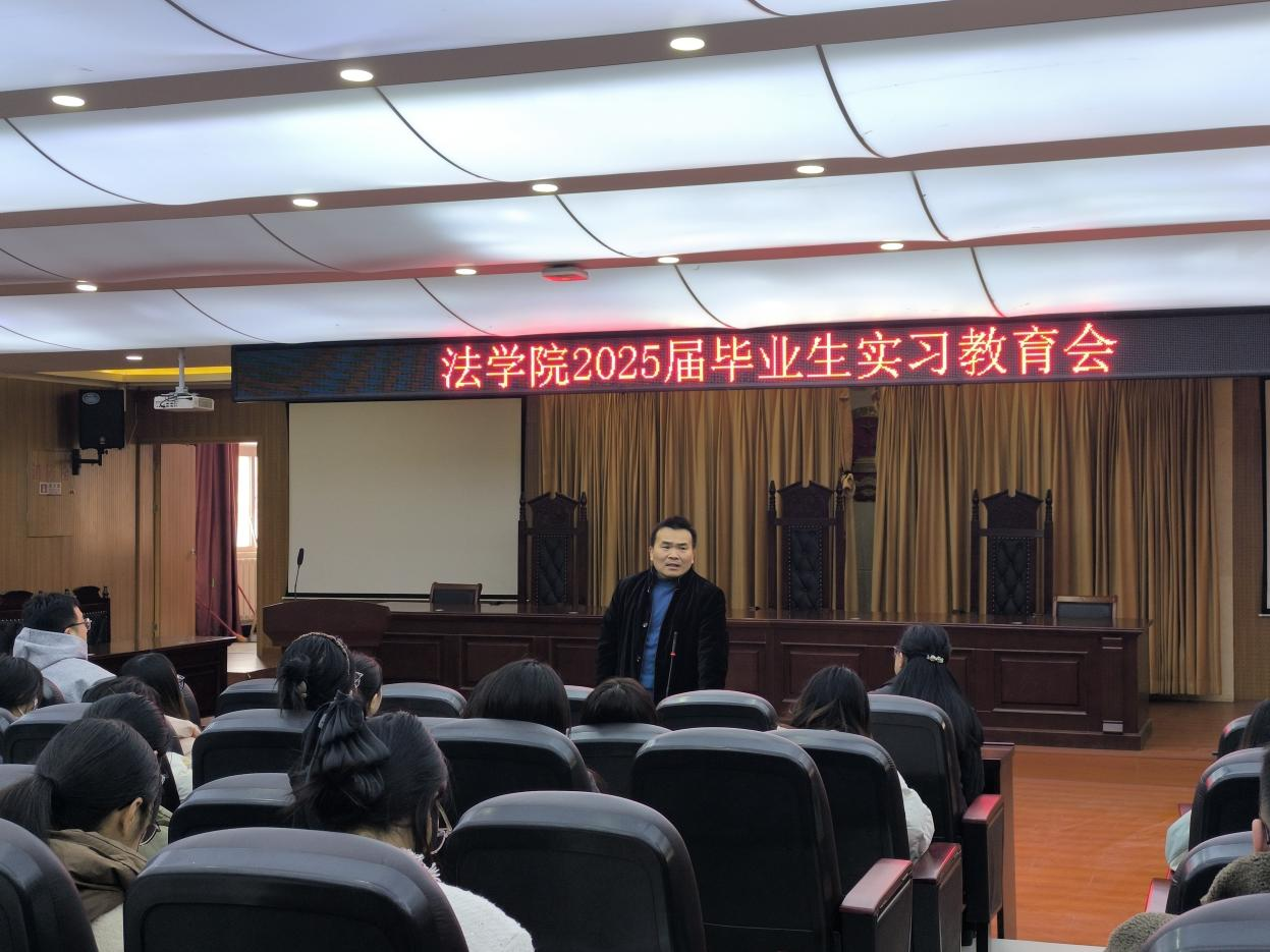 2月18日,法学院2025届毕业生实习教育会在东启智楼二楼模拟法庭顺利召开。法学院副院长冯振强及各实习单位带队老师参加本次会议。