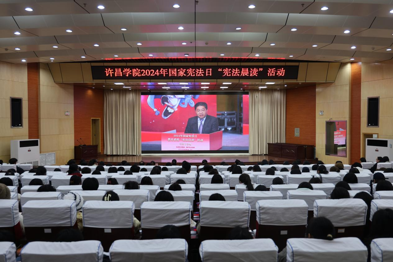 12月4日是第十一个国家宪法日。为深入学习宣传习近平法治思想,大力弘扬宪法精神,教育部在北京组织开展全国教育系统“宪法晨读”活动。我院在图书馆报告厅设立分会场,校党委副书记梁予昉、副校长潘春彩、纪委书记申占伟出席活动。党委宣传部、党委学工部、法制办公室、校团委及法学院等相关单位负责人以及300余名师生代表参加活动。