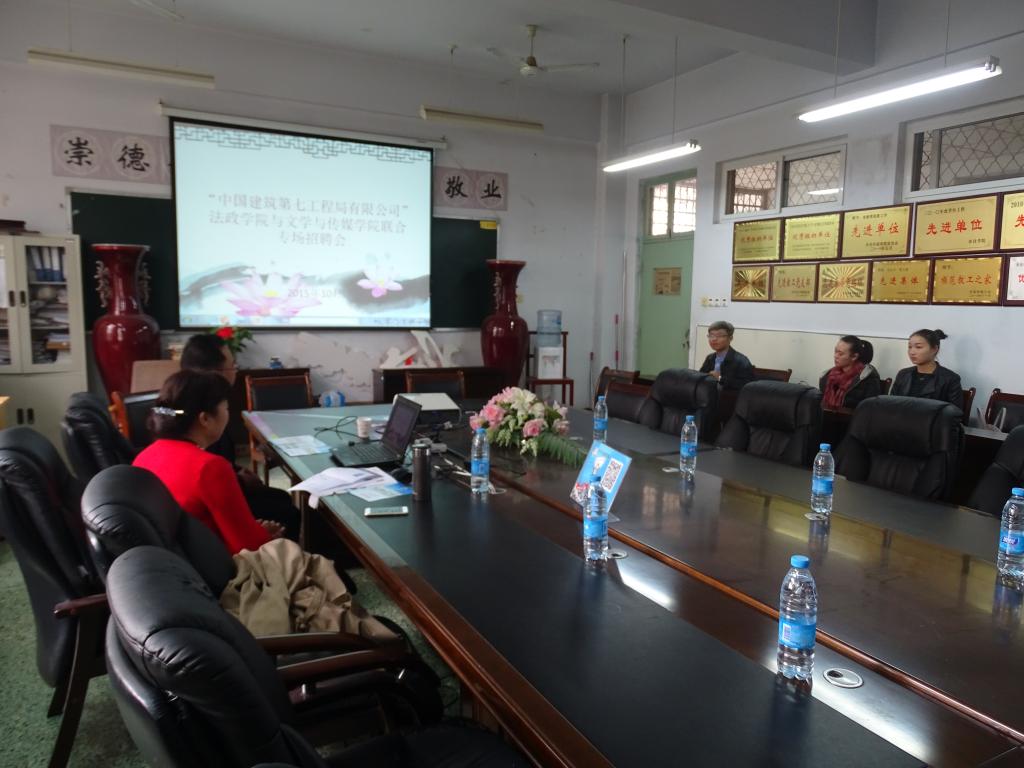 10月29日上午,法政学院与文学与传媒学院在A3楼会议室联合举办了专场招聘会,本次招聘会由中国建筑第七工程局有限公司为即将毕业者提供工作岗位。众多学生认真准备并积极参加此次招聘会。