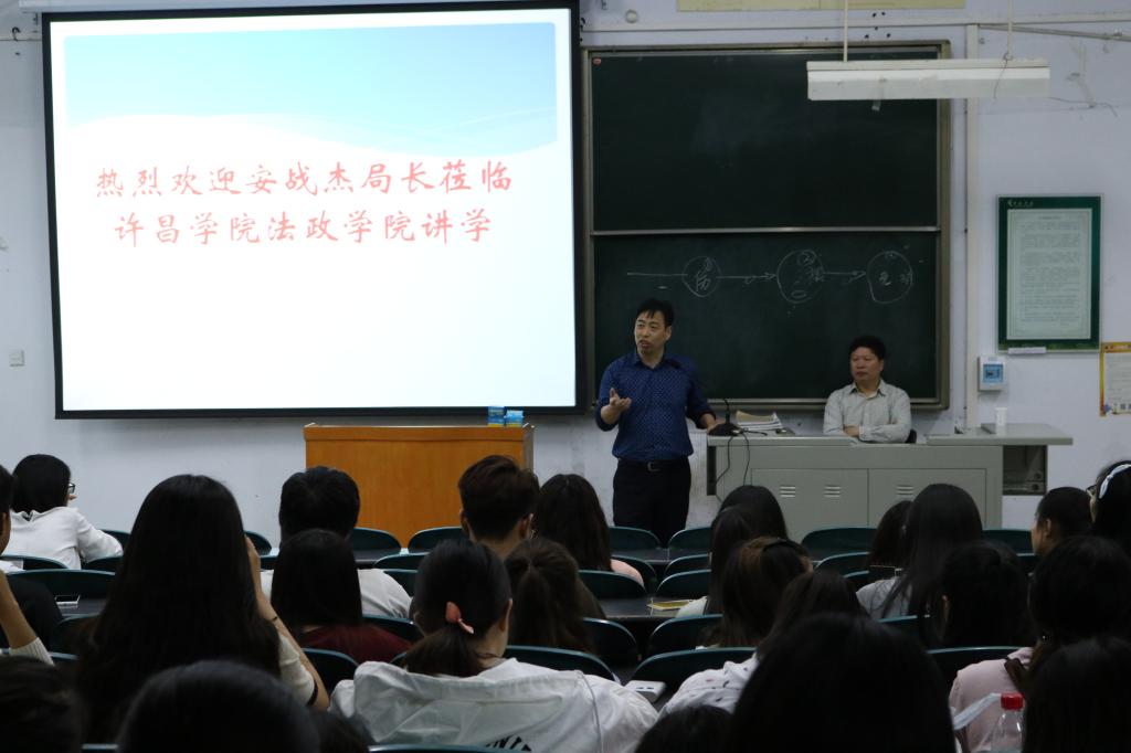 应法政学院邀请,5月4日下午,许昌市人民检察院刑事执行监察局副局长安战杰莅临我院开展法制讲座。法政学院党总支书记唐战立出席,2014、2015级法学专业学生到场聆听了此次讲座。