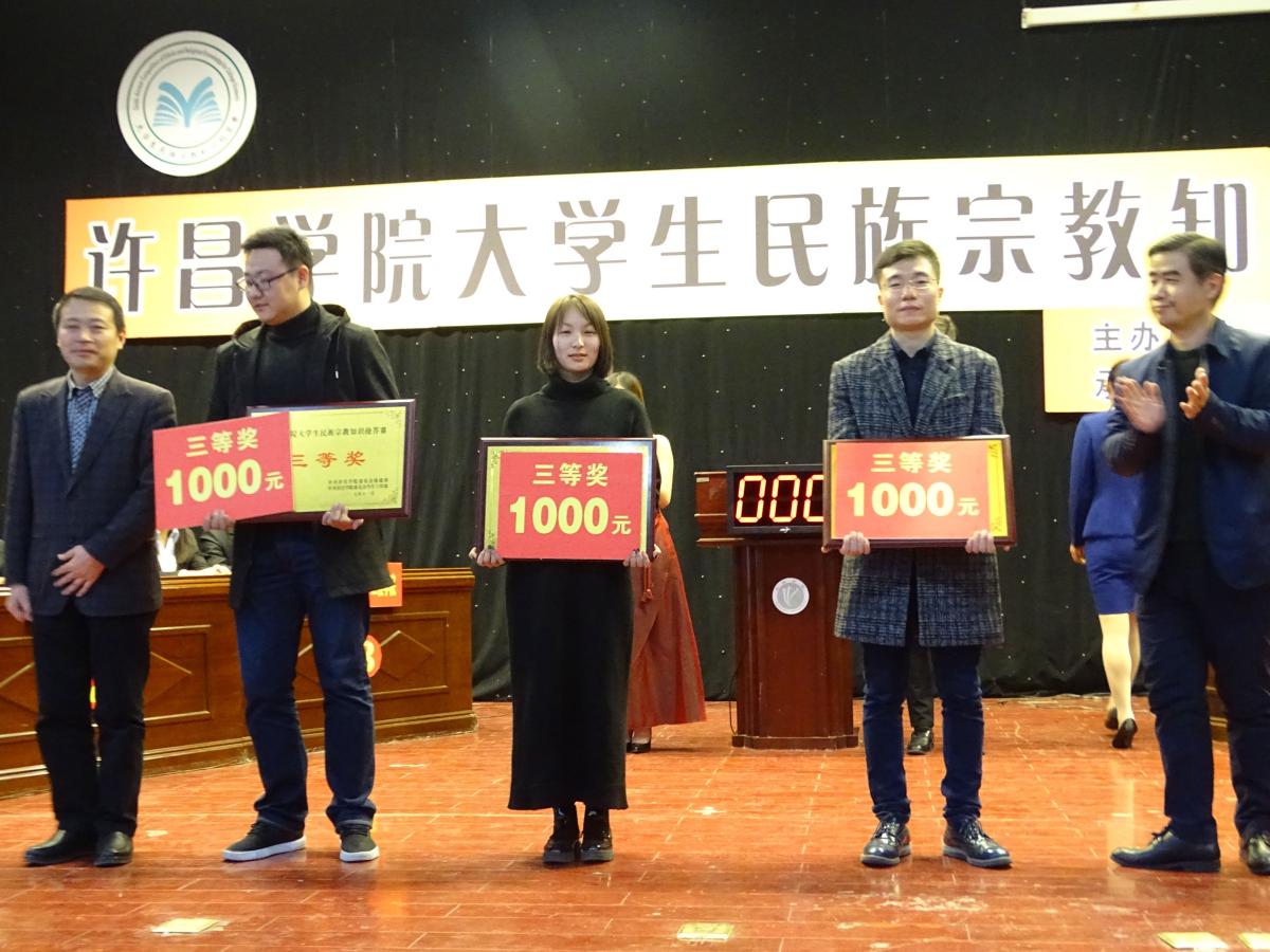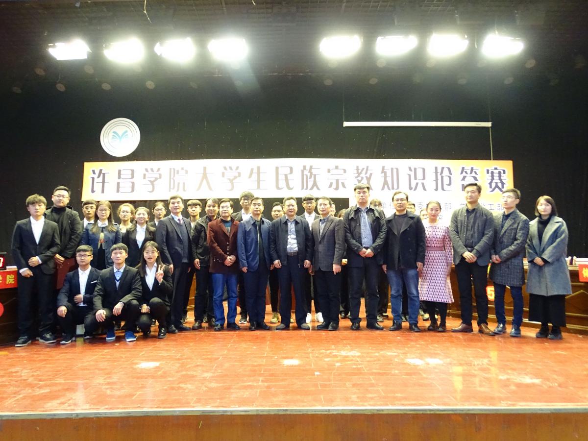 11月24日下午,由我校党委统战部、党委学工处主办,法政学院承办的许昌学院大学生民族宗教知识抢答赛在大学生活动中心圆满落幕。许昌学院党委副书记孙海、党委组织部部长陈遂德、党委宣传部部长冯晓民、党委统战部副部长黄高锋、团委副书记史若延,法政学院党总支书记唐战立、副书记黄春建以及各院系领导出席了本次活动并参加了颁奖仪式,各晋级决赛的院系师生代表观看了本次比赛。