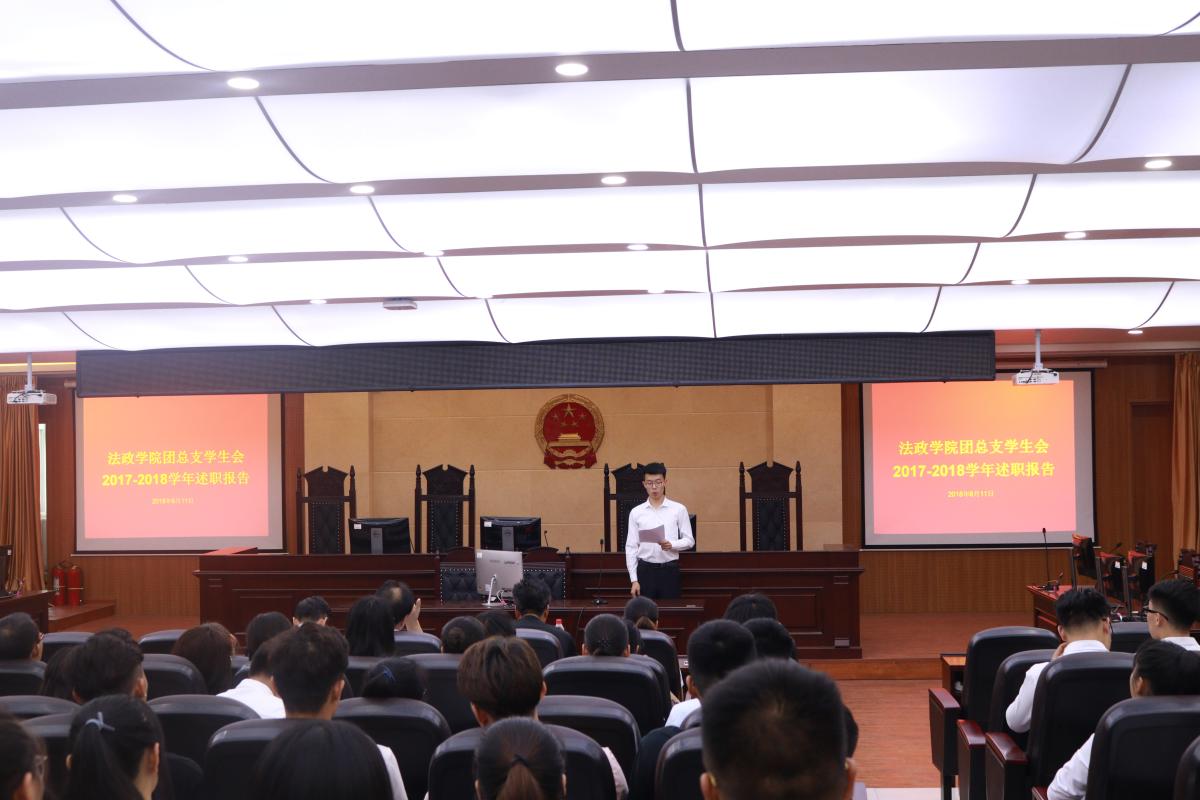 6月11日下午,法政学院于C合二模拟法庭成功召开2017——2018年度团总支学生会述职报告会议。法政学院党总支书记唐战立、党总支副书记黄春建、团总支负责人孙晨赫以及16级辅导员杨晓丽老师出席了本次报告会,述职报告会由学生会副主席马原主持,团总支学生会全体学生干部参加会议。