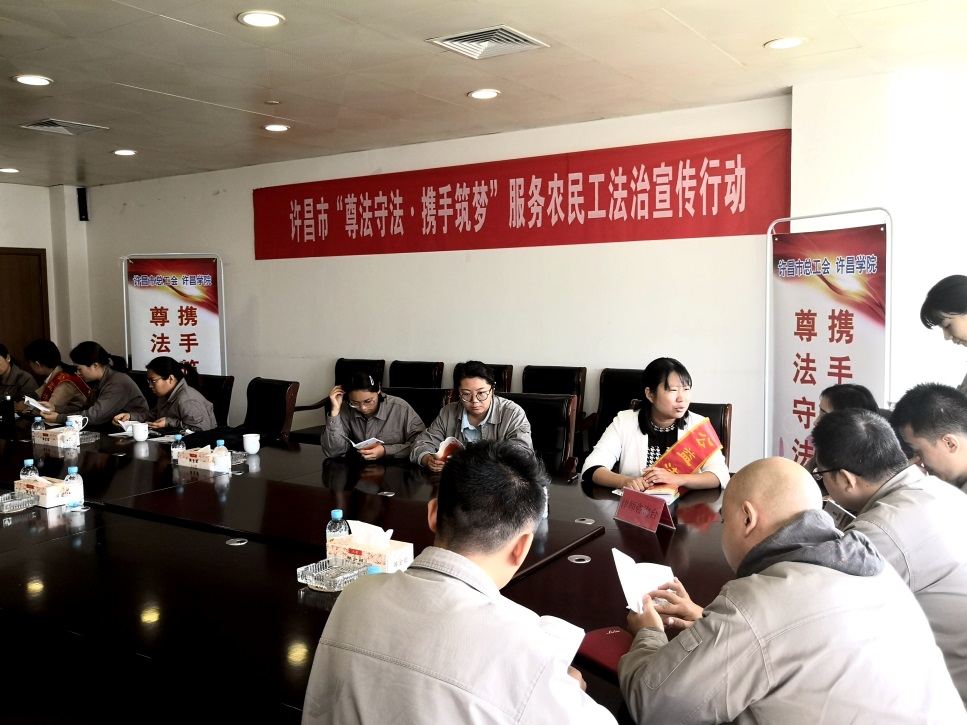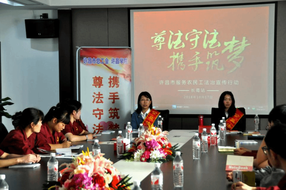 2018年10月17日和23日,许昌市总工会、许昌学院联合开展“尊法守法.携手筑梦”服务农民工法治宣传活动。服务小分队深入到河南(长葛)金宏印业、许昌烟草薄片有限公司,面对职工和农民工开展法治宣传活动。