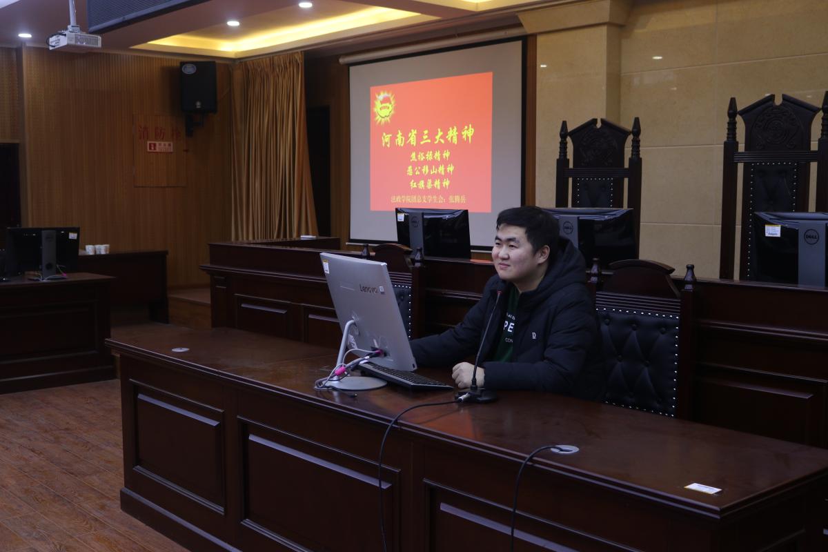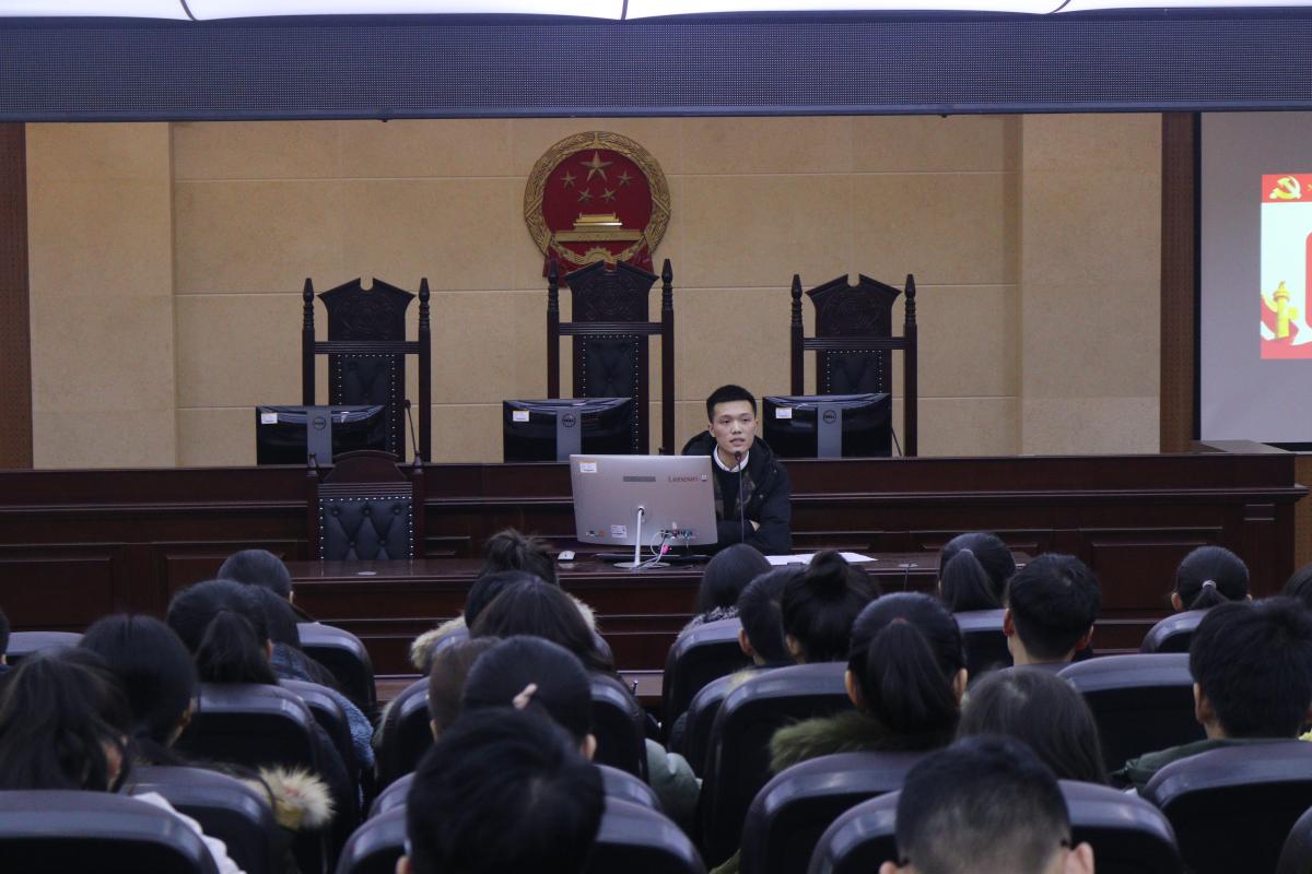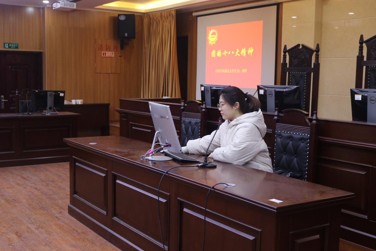 为把组织引导广大青年深入学习宣传贯彻习近平新时代中国特色社会主义思想和党的十九大精神,进一步发挥基层团组织的战斗堡垒和团干部的模范带动作用,按照校团委要求全团实施“青年大学习”活动的工作部署,法政学院于12月在模拟法庭开展四场团干部讲团课活动。活动由部分16级团总支学生会学生代表进行主持讲解,18级法本全体学生干部到场聆听学习。