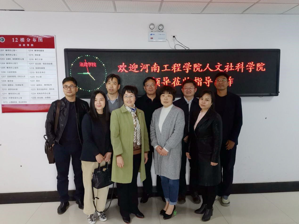 2019年4月11日,河南工程学院学生处处长耿时晓、人文社会科学院学院院长李威、副院长王沛莹、党委副书记祁洋波、科研办公室主任李松林及郭俊副教授等一行6人莅临我院考察交流工作。交流座谈会在文科综合楼1217会议室举行。我院院长崔秀花、党总支书记唐战立、法律系主任赵丽敏、科研秘书孙敬良和教学秘书林云飞等热情接待了来访客人。