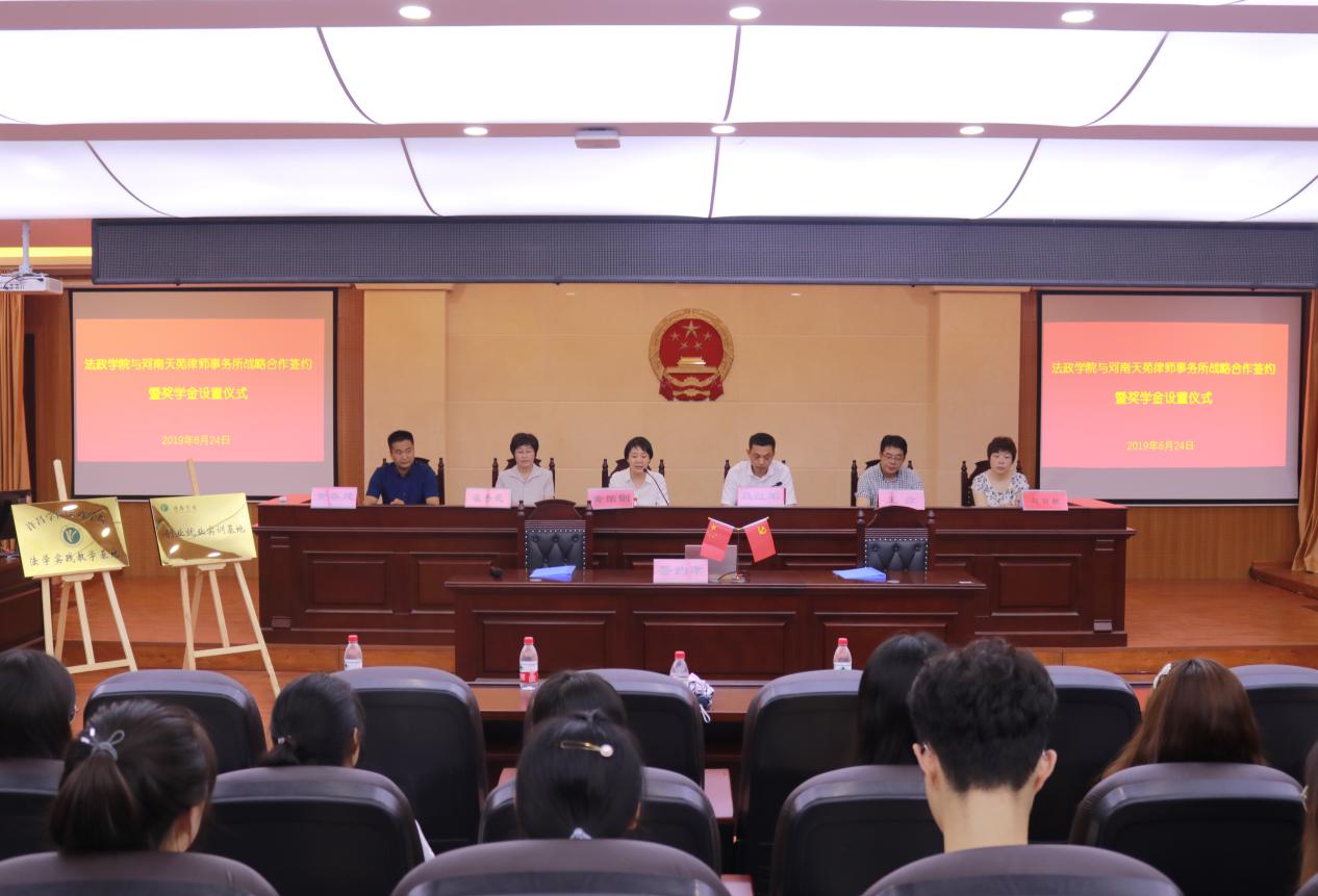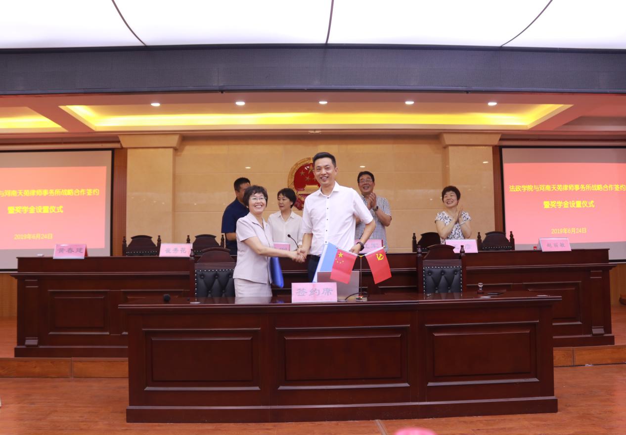 致辞结束后,法政学院院长崔秀花与河南天苑律师事务所主任马红军进行战略合作签约。根据双方协议,河南天苑律师事务所作为法政学院校外实践教学基地和创业就业实训基地,每年接收法政学院优秀学子进行实践培训,在专业见习、毕业见习、法律案例实践等方面提供支持。同时,河南天苑律师事务所在我院设置“天苑奖学金”,共计30万元,用于奖励我院优秀法学生,首批已确定25名优秀学子。