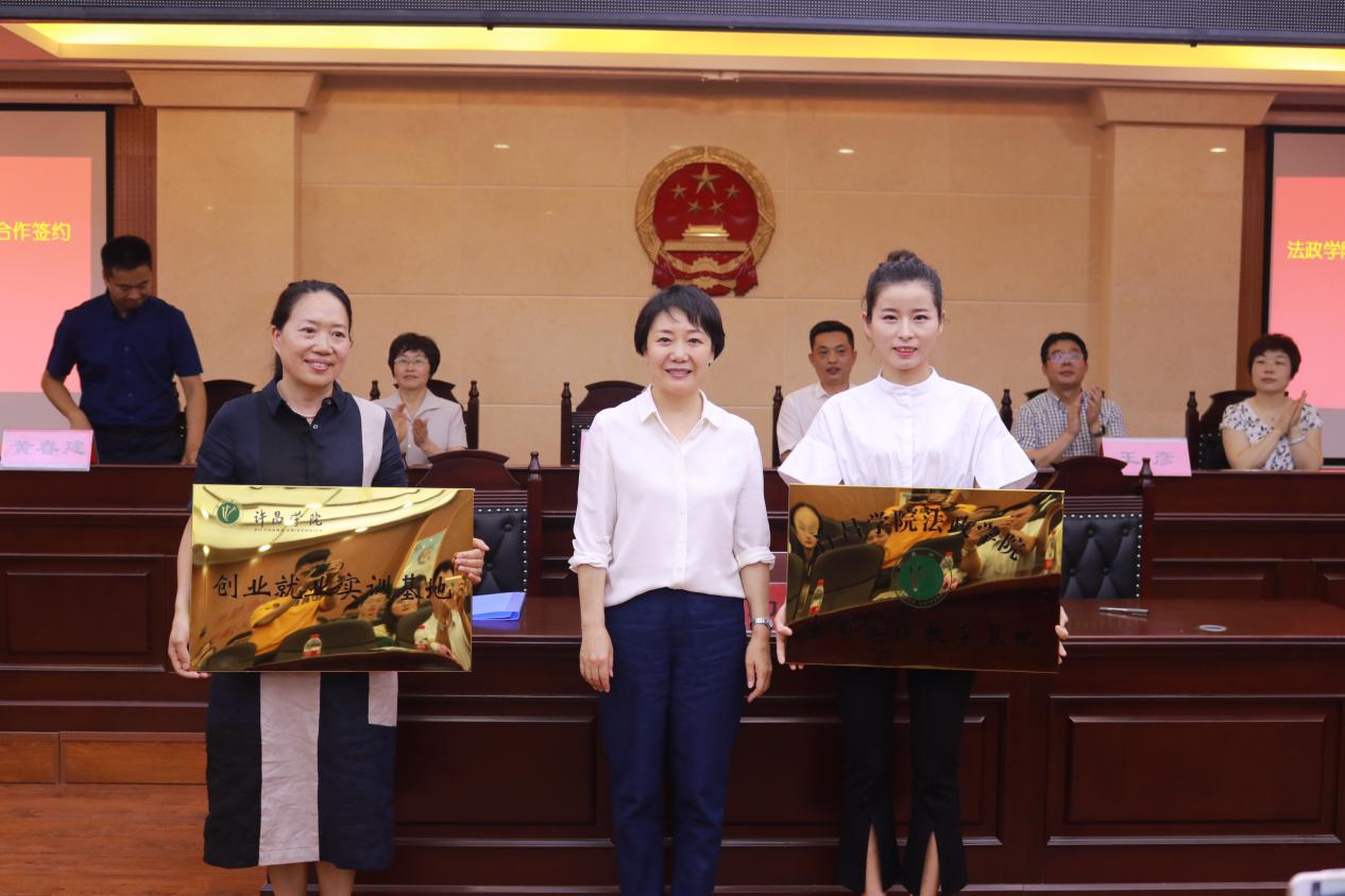 许昌学院副院长黄怡俐对河南天苑律师事务所进行“创业就业实训基地”“法学实践教学基地”授牌并合影留念。