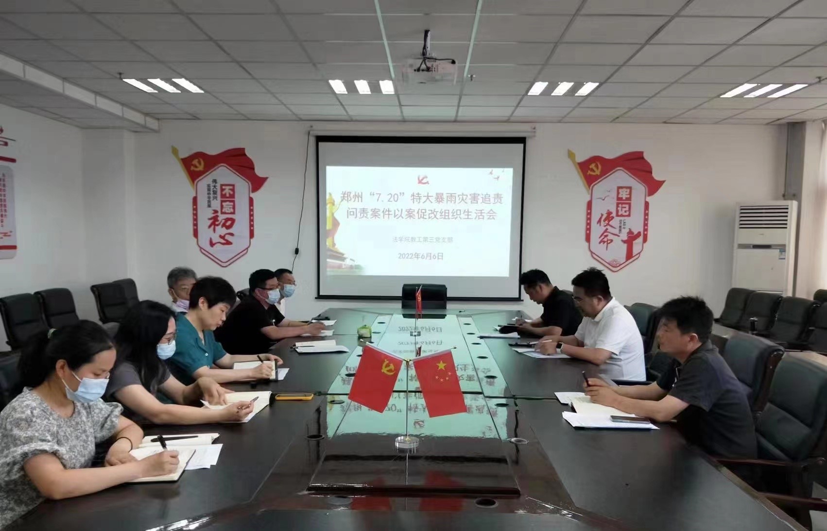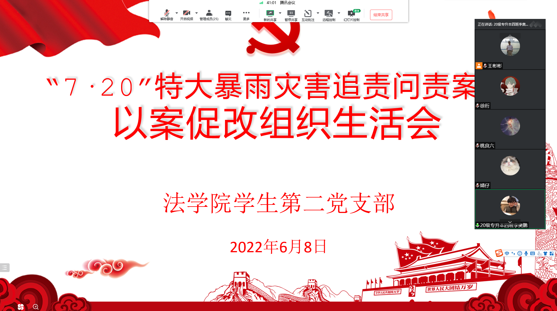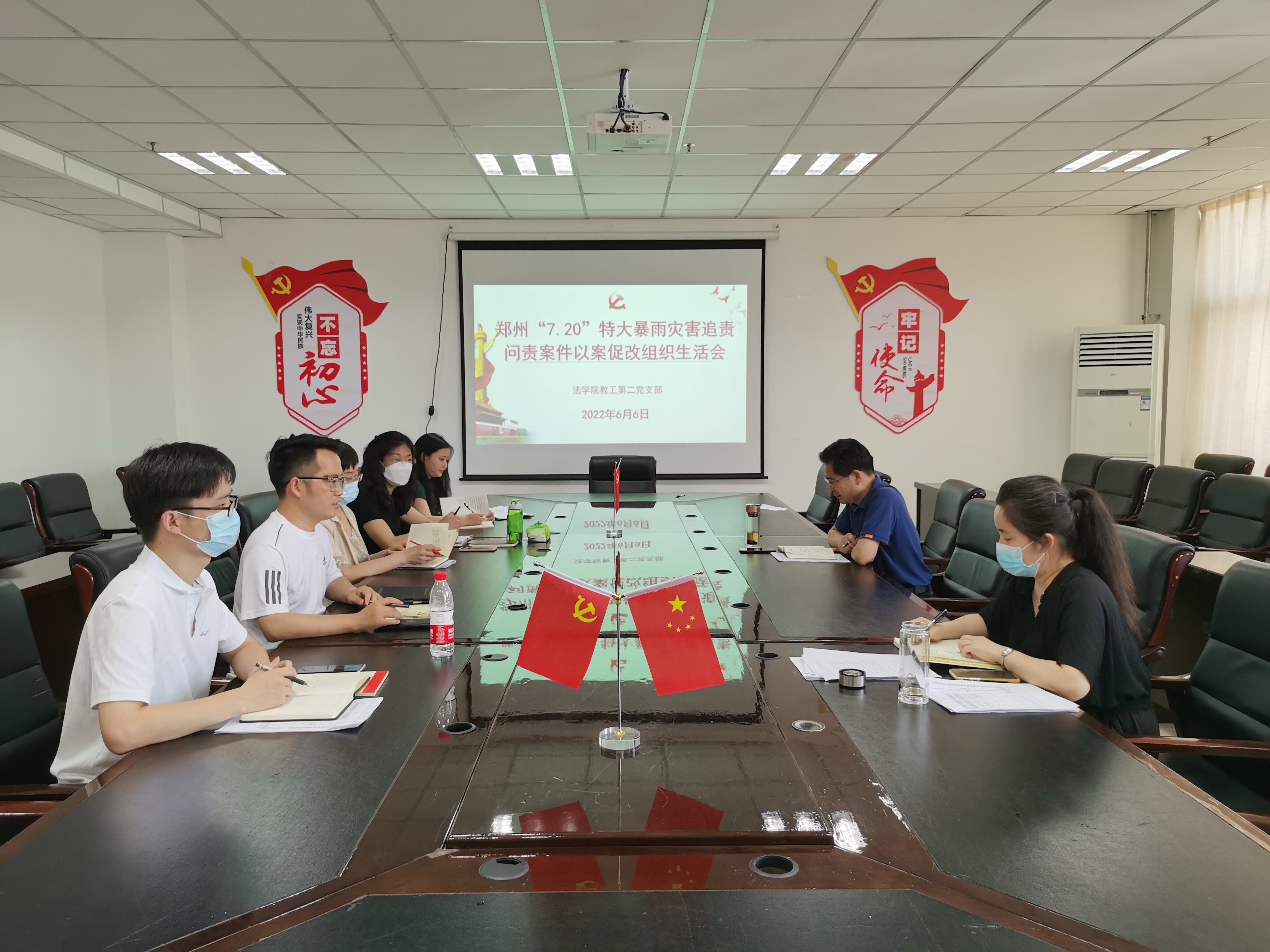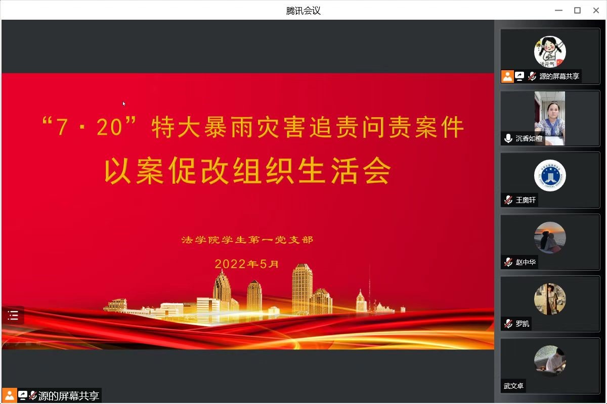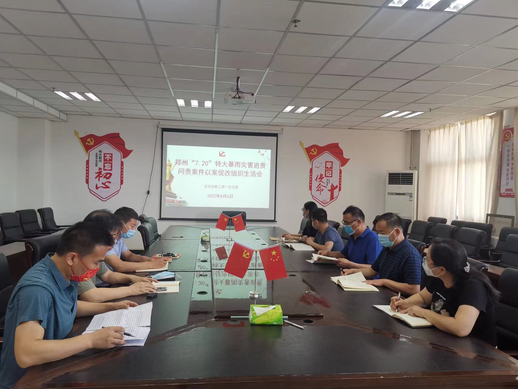 按照校党委组织部《关于开好“7·20”特大暴雨灾害追责问责案件以案促改组织生活会的通知》要求,法学院教工第一、第二、第三党支部于2022年6月6日在文科综合楼1225分别召开了组织生活会,学生第一、第二党支部分别于5月27日和6月8日以腾讯会议的方式线上召开了组织生活会。会议由各党支部书记主持,支部全体党员参加。