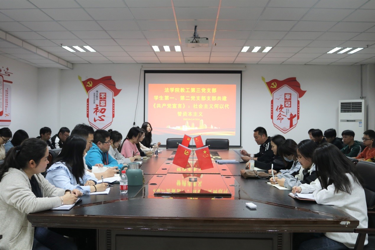 2023年3月10日晚,法学院教工第三党支部与学生第一党支部、第二党支部开展支部共建“红色经典系列活动”第二期。本次活动的主题是:解读《共产党宣言》——社会主义何以代替资本主义。会议由教工第三党支部书记尹晓兵主持并主讲,学生第一党支部书记杨晓丽、学生第二党支部书记王彬彬和部分师生党员、入党积极分子共同参与。
