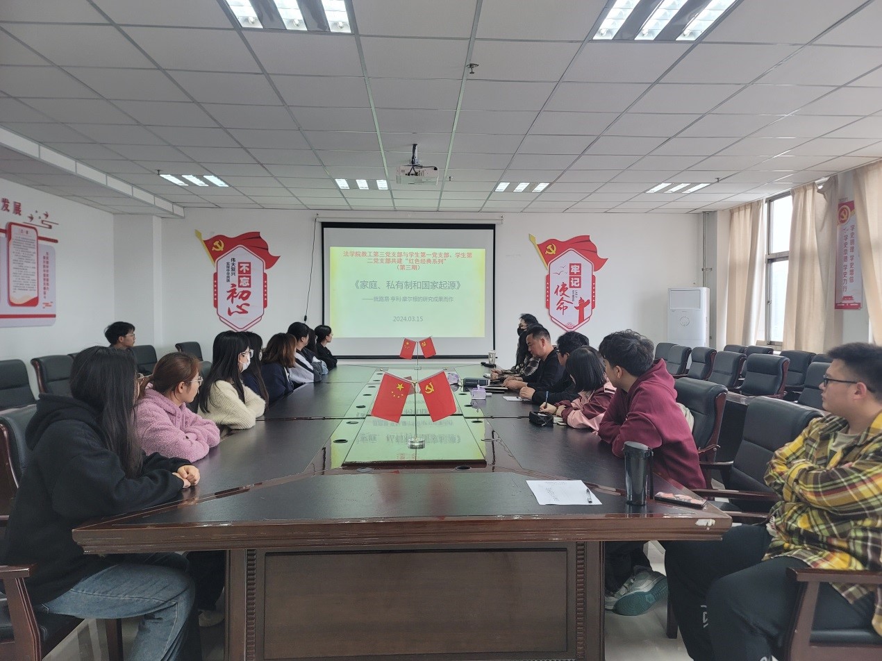2024年3月15日晚,法学院教工第三党支部与学生第一党支部、第二党支部开展支部共建“红色经典系列活动”第三期。本次活动的主题是:解读《家庭、私有制和国家的起源》——历史唯物主义的完善。活动由教工第三党支部书记尹晓兵主持并主讲,党员教师魏笑、王彬彬、杨晓丽等以及20多位同学参与。