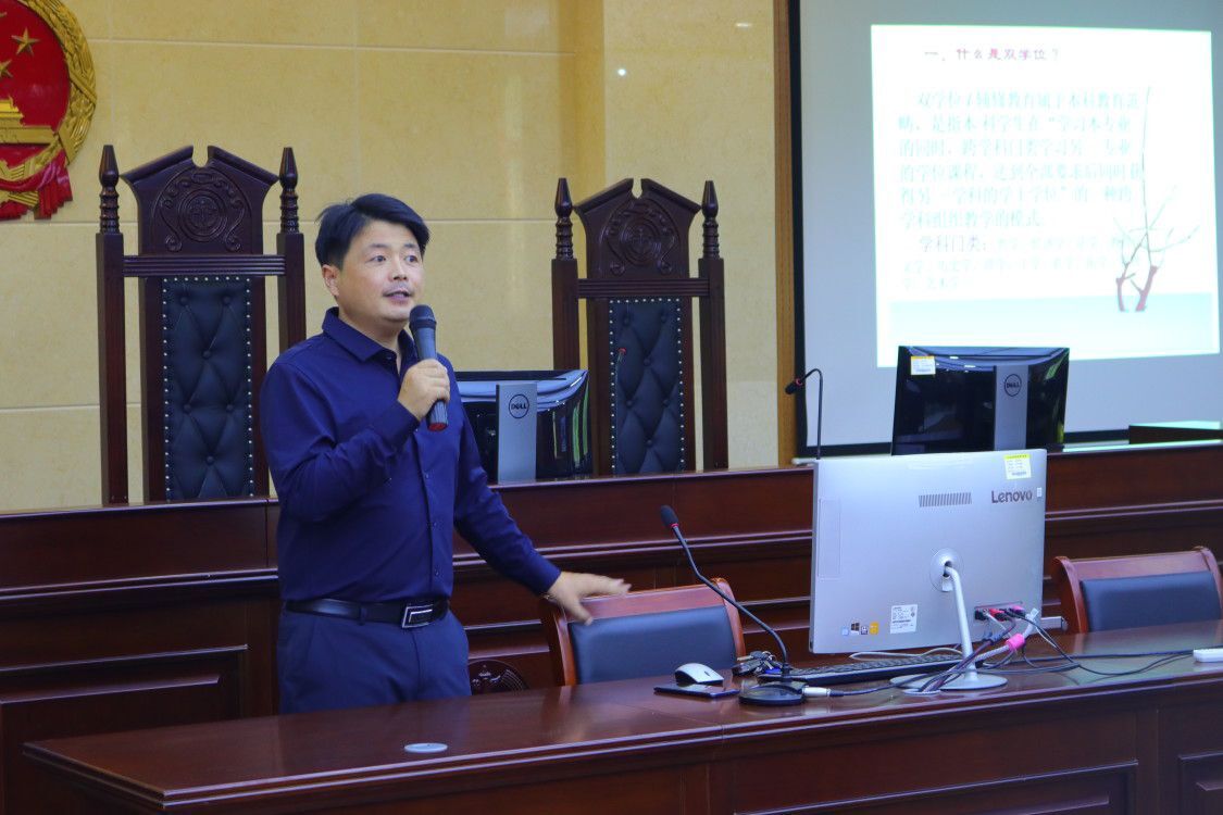 9月25日下午,法学院法学辅修学士学位推介座谈在C合2成功召开,在座谈会上,我院王忠灿副院长从我院法学辅修学位的基本规定和要求、辅修双学位的专业意义以及专业课程设置,法学辅修学位的报名方式和注意事项等四个方面向同学们进行了详细介绍,他建议学有余力的同学在充分考虑自己的学习情况后积极进行申报。随后,同学们就辅修学位与就业的关系、辅修专业与原专业在时间上是否存在冲突等问题向王副院长踊跃提问,并得到了耐心的解答,咨询学生数达到50余人。总的来看,同学们对于法学辅修专业拓展知识体系、提高就业质量等优势表示高度的认可。