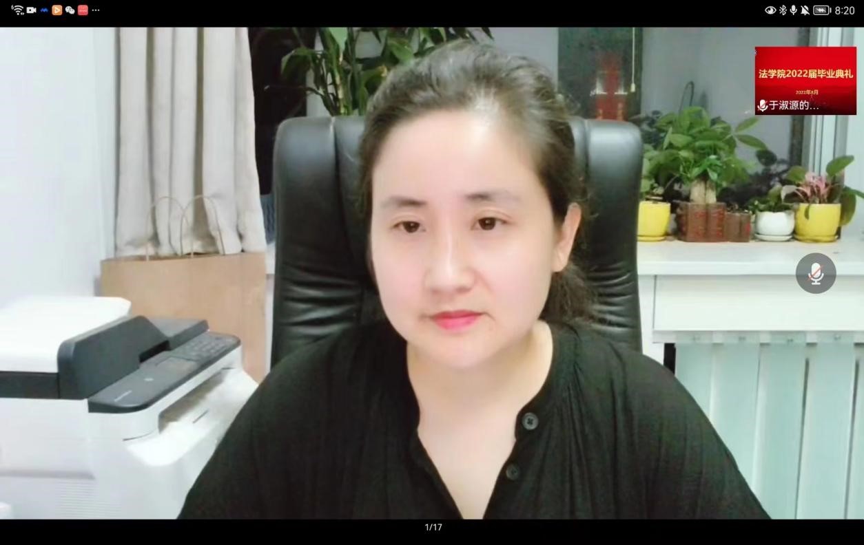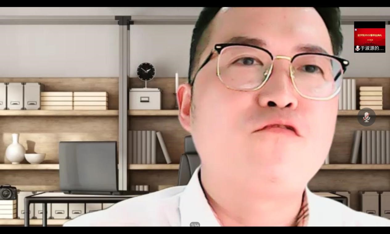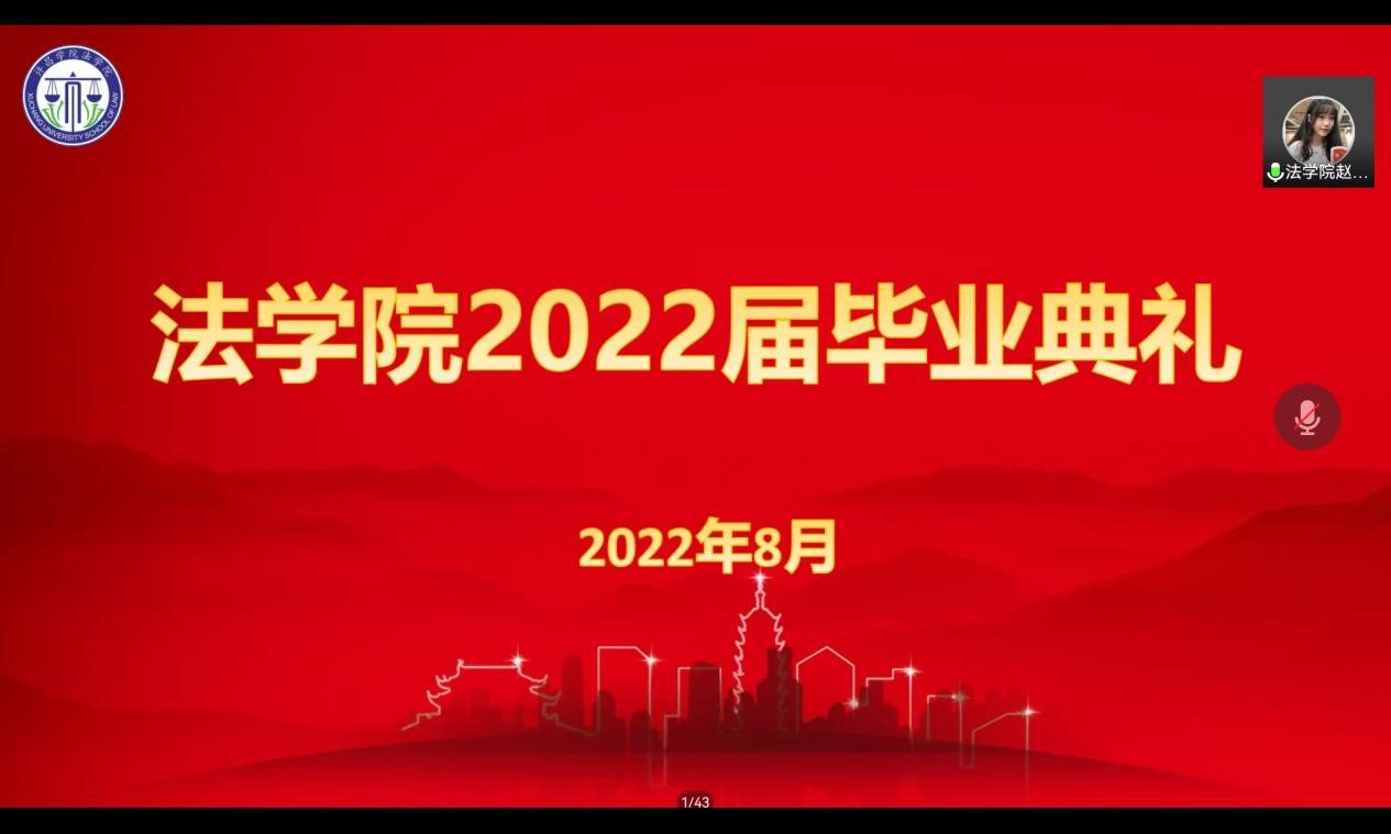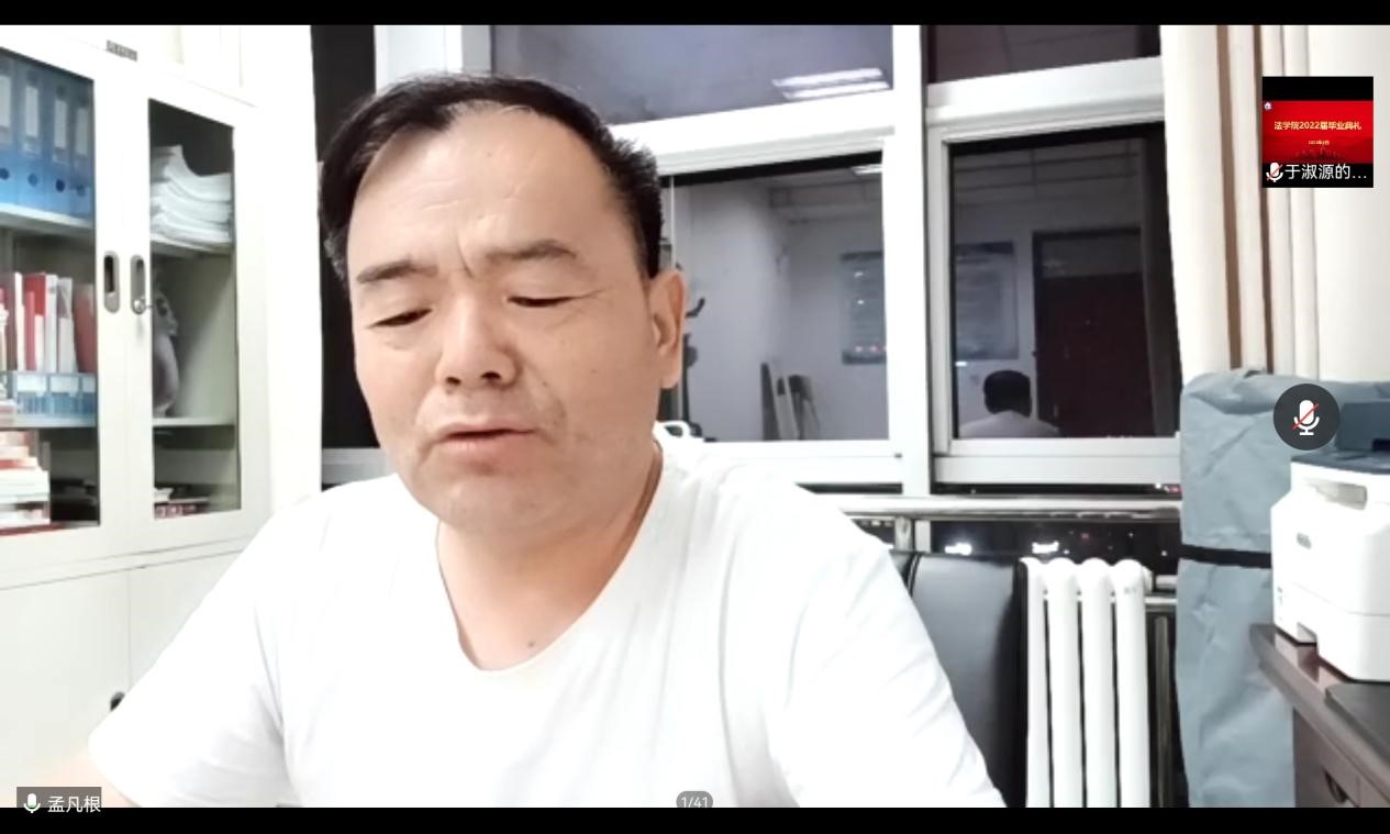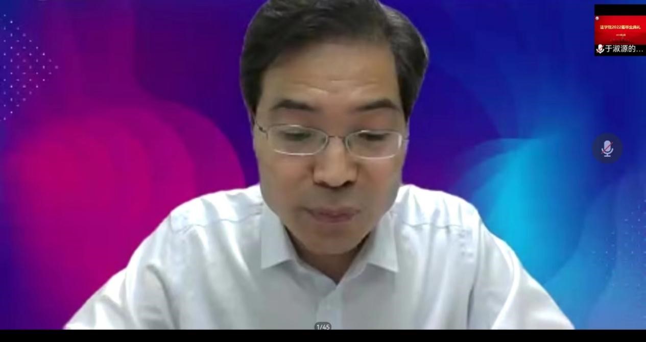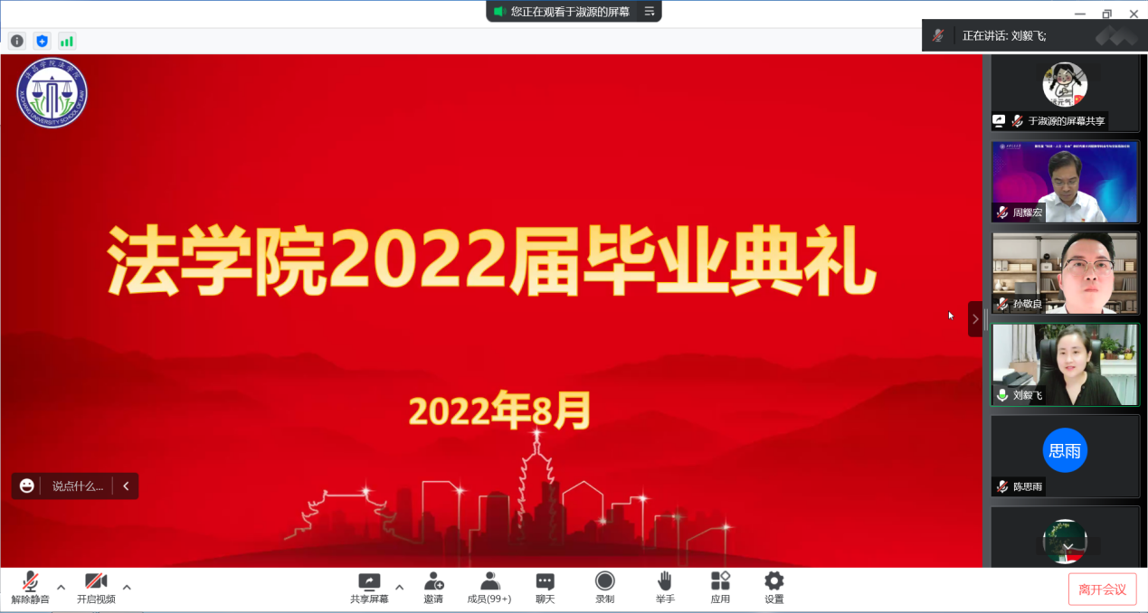 经年师生情,满堂祝福语,只赠学子行。2022年8月8日晚上,法学院在线上举办了2022届毕业典礼。法学院党委书记孟凡根、院长周耀宏、党委副书记刘毅飞、副院长赵丽敏、副院长王忠灿出席毕业典礼,教师代表、毕业班辅导员老师以及全体2022届毕业生参加典礼。典礼由刘毅飞主持。