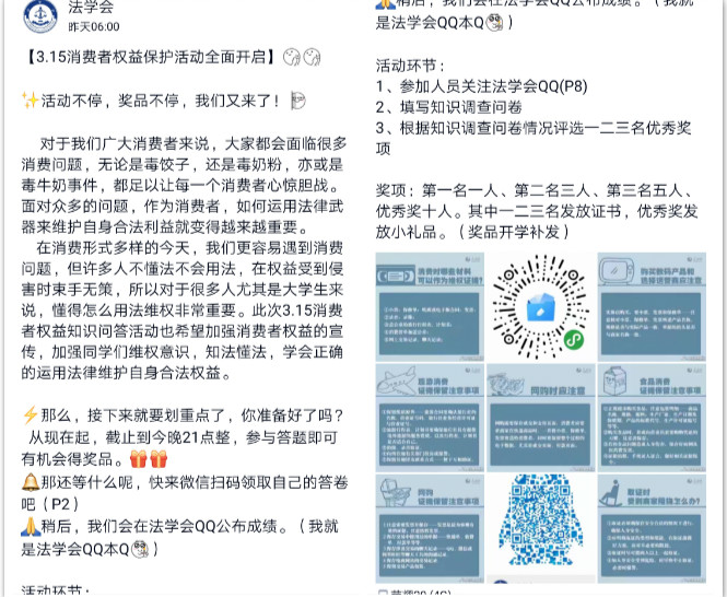 春风三月,法进万家,这个三月,不仅有绿色,还有正义!为迎接3·15消费者权益保护日的到来,我院法学会于2020年3月15日特开展了3·15消费者权益知识问答活动。