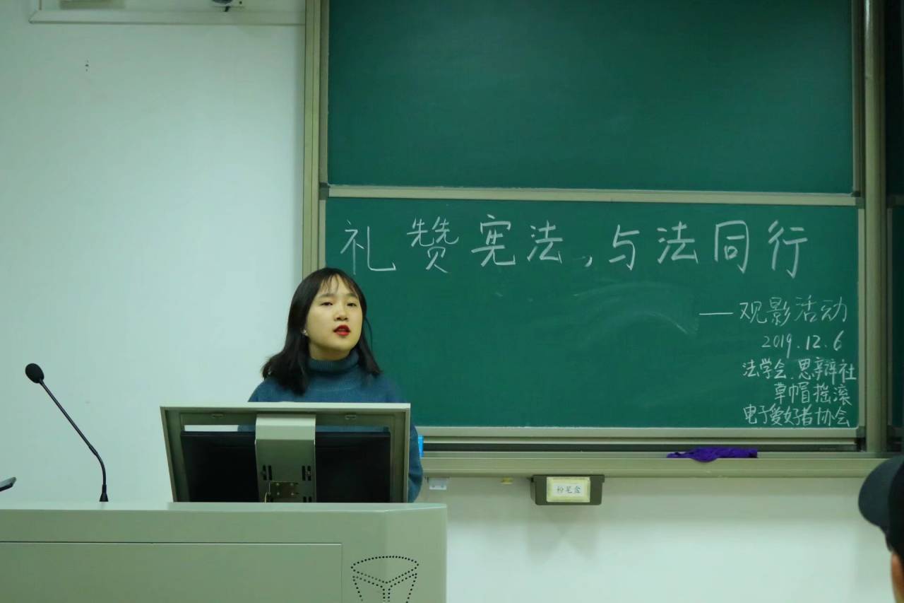 12月4日是国家宪法日,为了让同学们自觉履行维护宪法尊严、保障宪法实施的职责,努力在全校营造尊崇宪法、信仰法治的良好氛围,以“礼赞宪法,与法同行”为主题的观影活动于2019年12月6日下午七点半在E-304顺利举行。法学会诚邀思辩社、草帽摇滚社团以及电子爱好者协会共同参加此次观影活动,观影现场座无虚席。