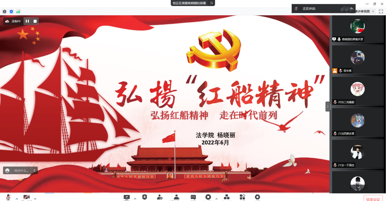 为加强入党积极分子对中国共产党历史的了解,培养红色精神,2022年6月29日,法学院学生第一党支部书记杨晓丽通过腾讯会议以“弘扬红船精神 走在时代前列”为主题开展入党积极分子培训,法学院第27入党积极分子全体到会聆听。