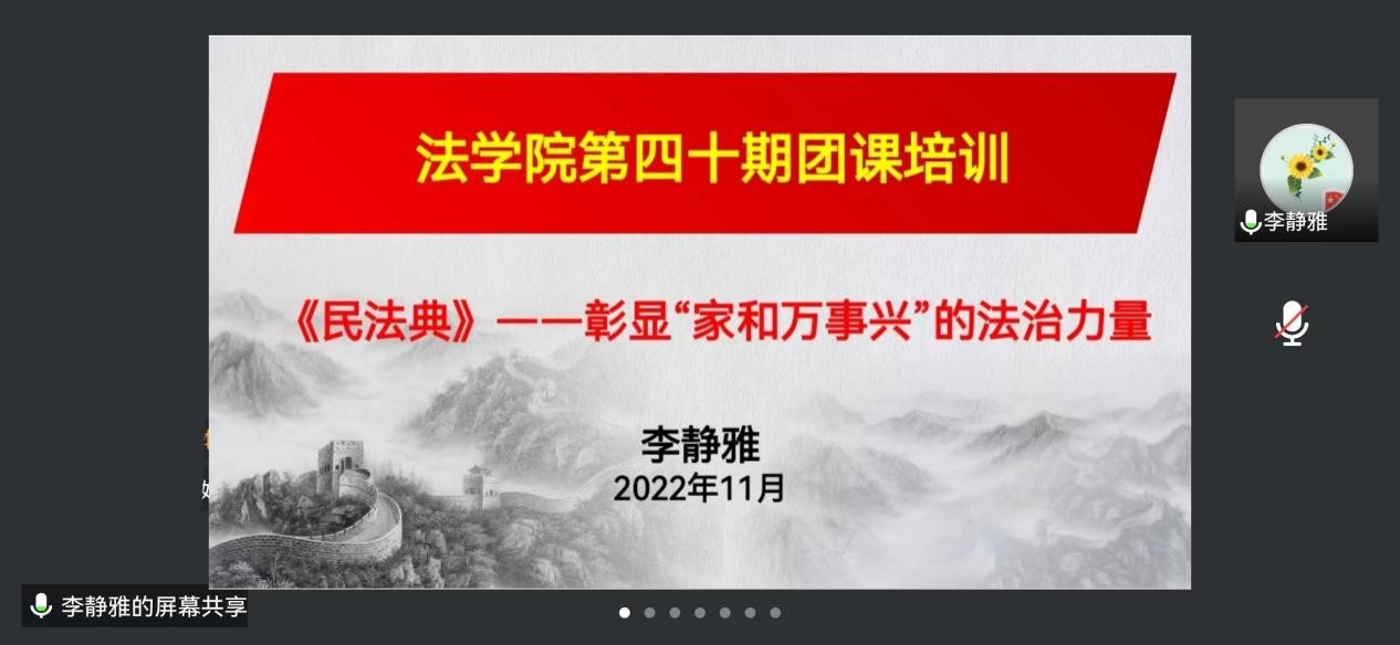 2022年11月26日,法学院以“《民法典》--彰显‘家和万事兴’的法治活动”为主题,开展了第40期业余团校培训课,本次团课由法学院2020级辅导员李静雅主讲,第40期分团校培训班全体成员参加学习。